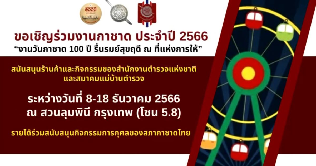 สำนักงานตำรวจแห่งชาติ และสมาคมแม่บ้านตำรวจ ขอเชิญชวนเข้าร่วมงานกาชาดประจำปี 2566 ระหว่างวันที่ 8 – 18 ธันวาคม นี้ อิ่มบุญ อิ่มใจไปพร้อมกัน