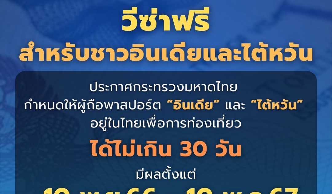 ประกาศกระทรวงมหาดไทย กำหนดให้ผู้ถือพาสปอร์ต “อินเดีย” และ “ไต้หวัน” อยู่ในไทยเพื่อการท่องเที่ยวได้ไม่เกิน 30 วัน มีผลตั้งแต่ 10 พ.ย.66 – 10 พ.ค.67