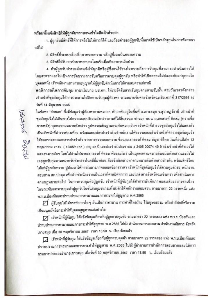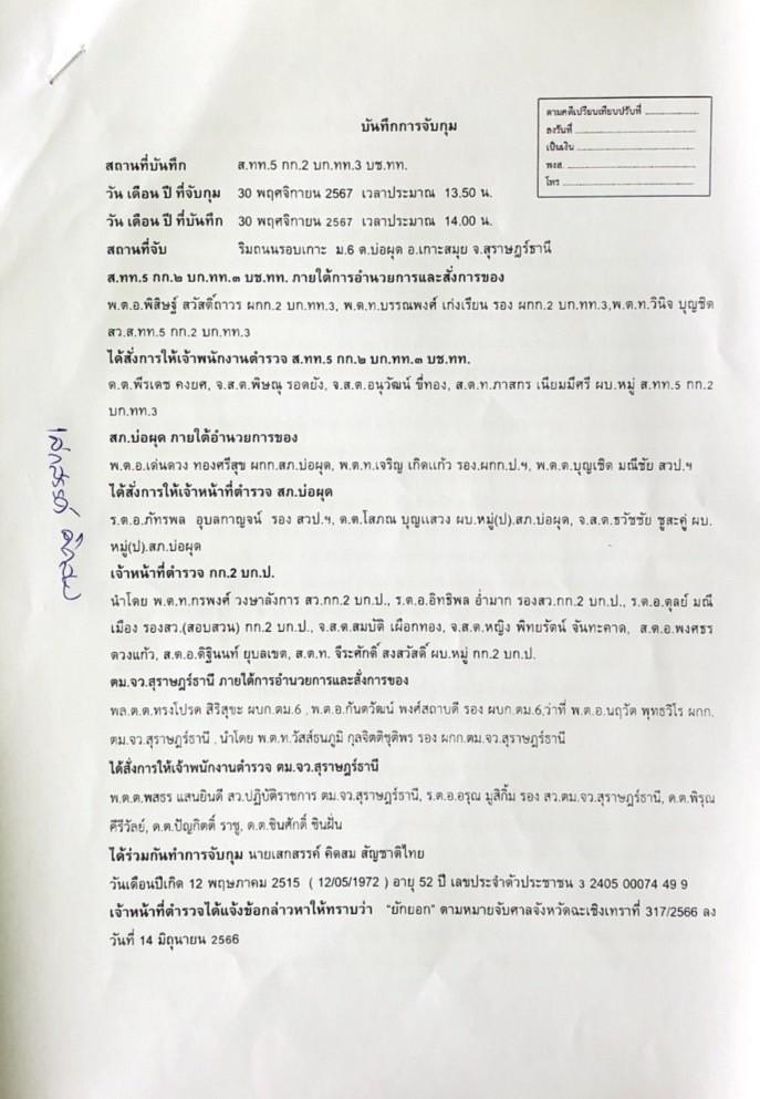 วันที่ 30 พ.ย.67 เวลา 13.50น. พ.ต.ต.พสธร แสนยินดี สว.สส.บก.ตม.6 ปฏิบัติราชการ ตม.จว.สุราษฎร์ธานี ,ร.ต.อ.อรุณ มูสิกิ้ม รอง สว.ตม.จว.สุราษฎร์ธานี พร้อมด้วยเจ้าหน้าที่สืบสวน ชป.3 ร่วมกับเจ้าหน้าตำรวจท่องเที่ยวเกาะสมุย จับกุม นายเสกสรรค์ คิดสม อายุ 52 ปี สัญชาติ ไทย หมายเลขประจำตัวประชาชน 3240500074499