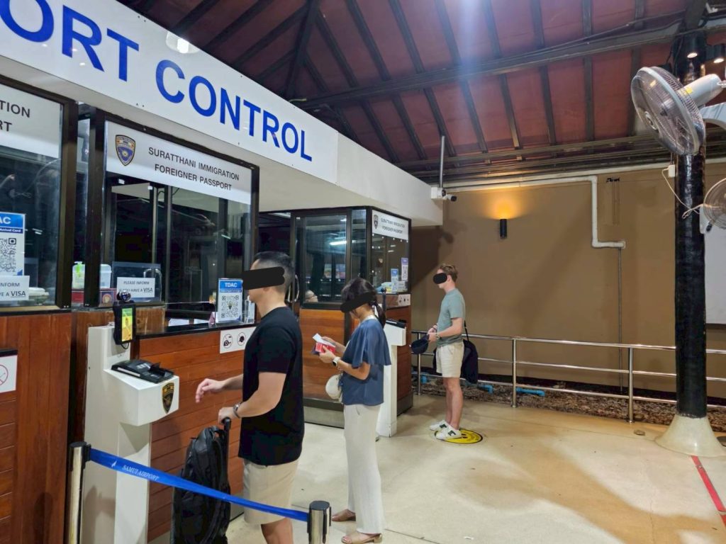 ร.ต.อ.หญิง ภาวดี หวานทอง ,ร.ต.อ.ธฤติพัฒน์ สมมะลวน,ร.ต.อ.หญิง จันทร์จิรา วิถี รอง สว.ตม.จว.สุราษฎร์ธานี พร้อมด้วยเจ้าหน้าที่ ตม.จว.สุราษฎร์ธานี (ทอ.สมุย) ปฏิบัติหน้าที่ตรวจบุคคลและพาหนะทางอากาศ, Overstay, Visa on arrival พร้อมดูแล ช่วยเหลือ อำนวยความสะดวกและความเรียบร้อยในแถวระหว่างรอเข้าใช้บริการให้กับผู้โดยสารที่เดินทางเข้า-ออก ทางอากาศในเขตพื้นที่รับผิดชอบประจำสนามบินสมุย อ.เกาะสมุย จว.สุราษฎร์ธานี