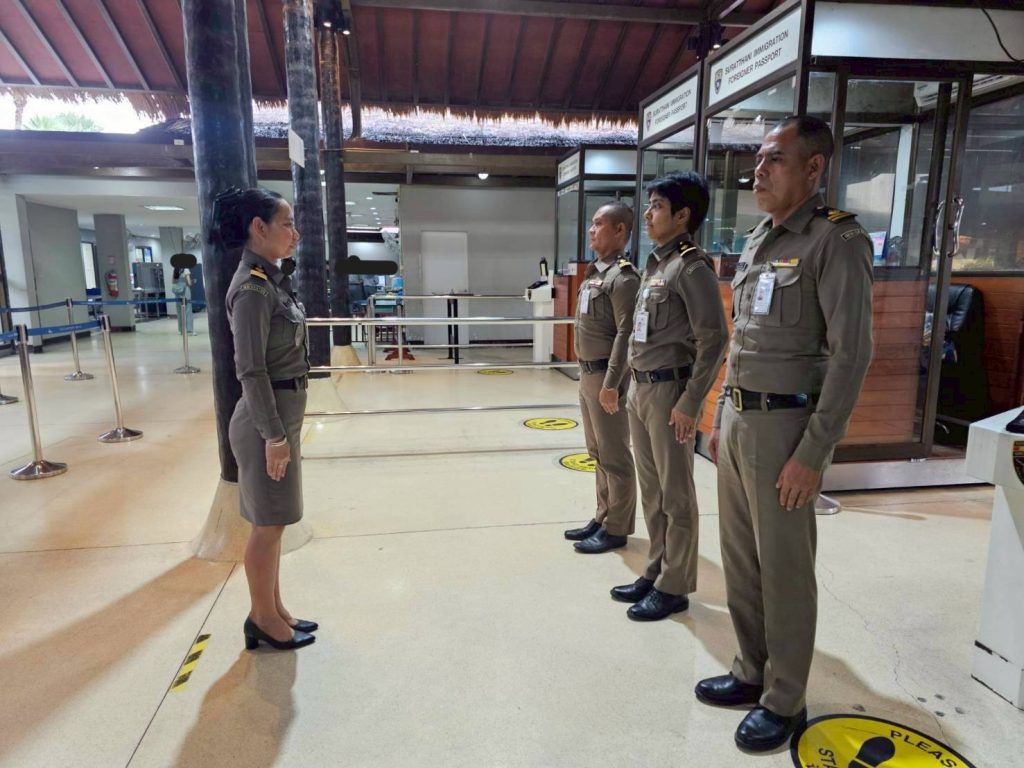 วันที่ 17 พ.ค.68 ร.ต.อ.หญิง ภาวดี หวานทอง , ร.ต.อ.ธฤติพัฒน์ สมมะลวน, ร.ต.อ.หญิง จันทร์จิรา วิถี รอง สว.ตม.จว.สุราษฎร์ธานี พร้อมด้วยเจ้าหน้าที่ ตม.จว.สุราษฎร์ธานี (ทอ.สมุย) ปฏิบัติหน้าที่ตรวจบุุคคลและพาหนะทางอากาศ, Overstay, Visa on arrival พร้อมดูแล ช่วยเหลือ อำนวยความสะดวกและความเรียบร้อยในแถวระหว่างรอเข้าใช้บริการให้กับผู้โดยสารที่เดินทางเข้า-ออก ทางอากาศในเขตพื้นที่รับผิดชอบประจำสนามบินสมุย อ.เกาะสมุย จว.สุราษฎร์ธานี