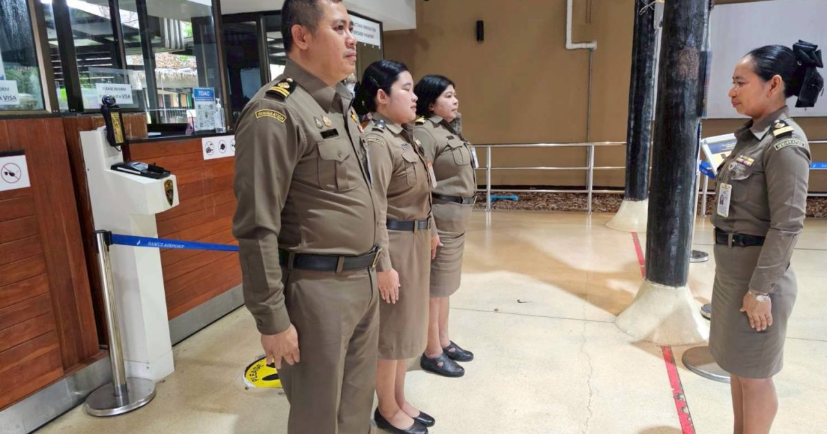 วันที่ 19 พ.ค.68 ร.ต.อ.หญิง ภาวดี หวานทอง ,ร.ต.อ.ธฤติพัฒน์ สมมะลวน, ร.ต.อ.หญิง จันทร์จิรา วิถี รอง สว.ตม.จว.สุราษฎร์ธานี พร้อมด้วยเจ้าหน้าที่ ตม.จว.สุราษฎร์ธานี (ทอ.สมุย) ปฏิบัติหน้าที่ตรวจบุคคลและพาหนะทางอากาศ, Overstay, Visa on arrival พร้อมดูแล ช่วยเหลือ อำนวยความสะดวกและความเรียบร้อยในแถวระหว่างรอเข้าใช้บริการให้กับผู้โดยสารที่เดินทางเข้า-ออก ทางอากาศในเขตพื้นที่รับผิดชอบประจำสนามบินสมุย อ.เกาะสมุย จว.สุราษฎร์ธานี