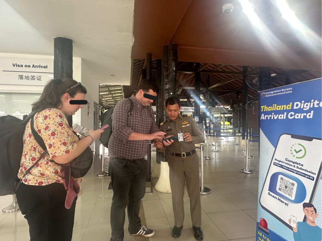 วันที่ 20 พ.ค.68 ร.ต.อ.ธฤติพัฒน์ สมมะลวน รอง สว.ตม.จว.สุราษฎร์ธานี ,ร.ต.อ.หญิง ภาวดี หวานทอง ,ร.ต.อ.หญิง จันทร์จิรา วิถี พร้อมด้วยเจ้าหน้าที่ ตม.จว.สุราษฎร์ธานี (ทอ.สมุย) ปฏิบัติหน้าที่ตรวจบุคคลและพาหนะทางอากาศ, Overstay, Visa on arrival พร้อมดูแล ช่วยเหลือ อำนวยความสะดวกและความเรียบร้อยในแถวระหว่างรอเข้าใช้บริการให้กับผู้โดยสารที่เดินทางเข้า-ออก ทางอากาศในเขตพื้นที่รับผิดชอบประจำสนามบินสมุย อ.เกาะสมุย จว.สุราษฎร์ธานี