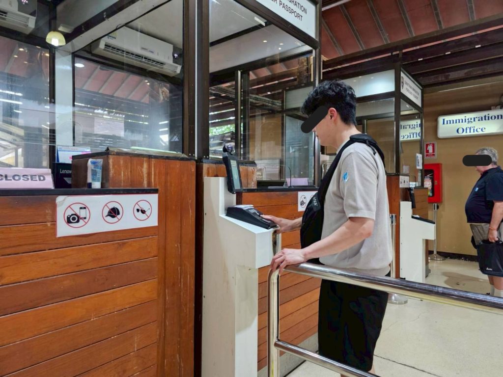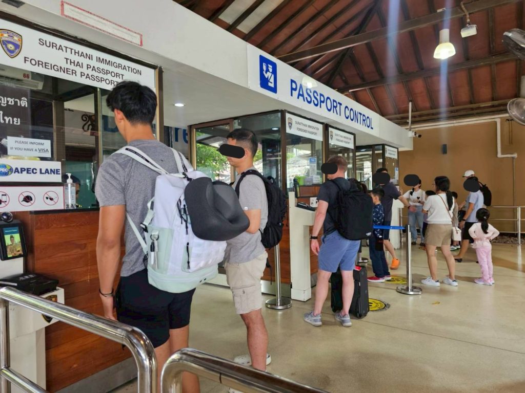 ร.ต.อ.หญิง ภาวดี หวานทอง ,ร.ต.อ.ธฤติพัฒน์ สมมะลวน,ร.ต.อ.หญิง จันทร์จิรา วิถี รอง สว.ตม. จว.สุราษฎร์ธานี พร้อมด้วยเจ้าหน้าที่ ตม.จว. สุราษฎร์ธานี (ทอ.สมุย) ปฏิบัติหน้าที่ตรวจบุคคลและพาหนะทางอากาศ, Overstay, Visa on arrival พร้อมดูแล ช่วยเหลือ อำนวยความสะดวกและความเรียบร้อยในแถวระหว่างรอเข้าใช้บริการให้กับผู้โดยสารที่เดินทางเข้า-ออก ทางอากาศในเขตพื้นที่รับผิดชอบประจำสนามบินสมุย อ.เกาะสมุย จว.สุราษฎร์ธานี