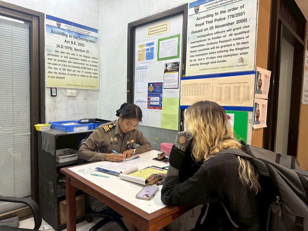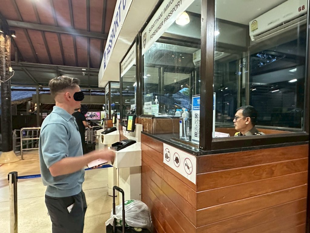 วันที่ 19 มิ.ย.68 ร.ต.อ.ธฤติพัฒน์ สมมะลวน รอง สว.ตม.จว.สุราษฎร์ธานี ,ร.ต.อ.หญิง ภาวดี หวานทอง ,ร.ต.อ.หญิง จันทร์จิรา วิถี พร้อมด้วยเจ้าหน้าที่ ตม.จว.สุราษฎร์ธานี (ทอ.สมุย) ปฏิบัติหน้าที่ตรวจบุคคลและพาหนะทางอากาศ, Overstay, Visa on arrival พร้อมดูแล ช่วยเหลือ อำนวยความสะดวกและความเรียบร้อยในแถวระหว่างรอเข้าใช้บริการให้กับผู้โดยสารที่เดินทางเข้า-ออก ทางอากาศในเขตพื้นที่รับผิดชอบประจำสนามบินสมุย อ.เกาะสมุย จว.สุราษฎร์ธานี