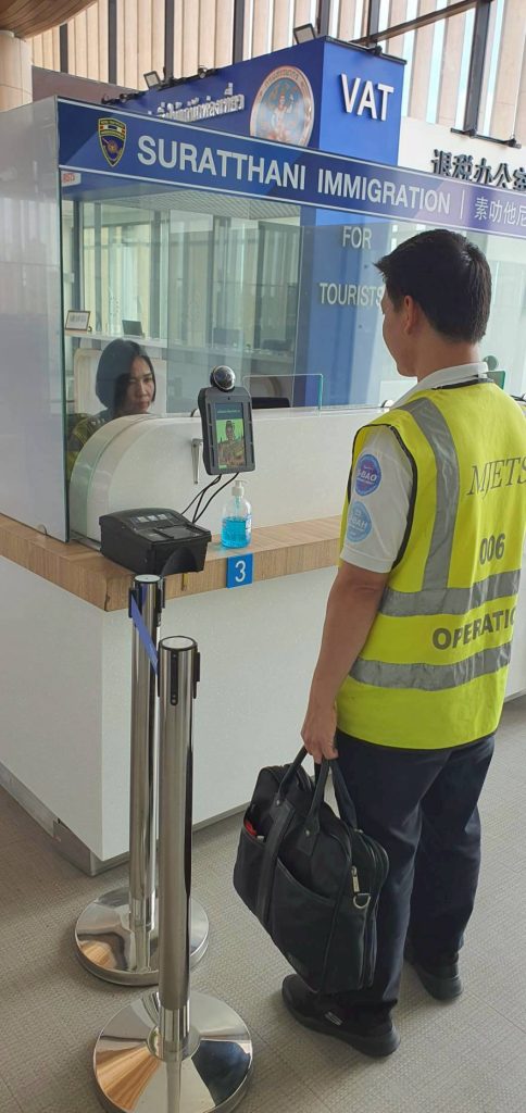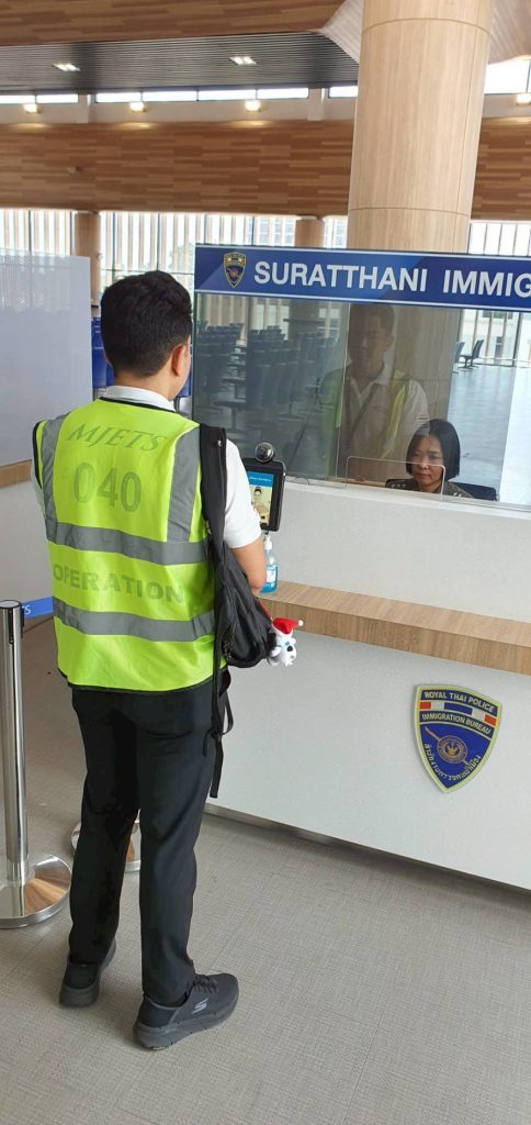 วันที่ 4 พ.ค.68 ร.ต.อ.หญิง อลิตสรา วงษ์แก้ว รอง สว.ตม.จว.สุราษฎร์ธานี พร้อมด้วยเจ้าหน้าที่ ตม.จว.สุราษฎร์ธานี (ทอ.สุราษฎร์ธานี) ปฏิบัติหน้าที่ตรวจบุคคลและพาหนะทางอากาศ, Overstay, Visa on arrival พร้อมดูแล ช่วยเหลือ อำนวยความสะดวกและความเรียบร้อยในแถวระหว่างรอเข้าใช้บริการให้กับผู้โดยสารที่เดินทางเข้า-ออก ทางอากาศในเขตพื้นที่รับผิดชอบประจำสนามบินสุราษฎร์ธานี อ.พุนพิน จว.สุราษฎร์ธานี