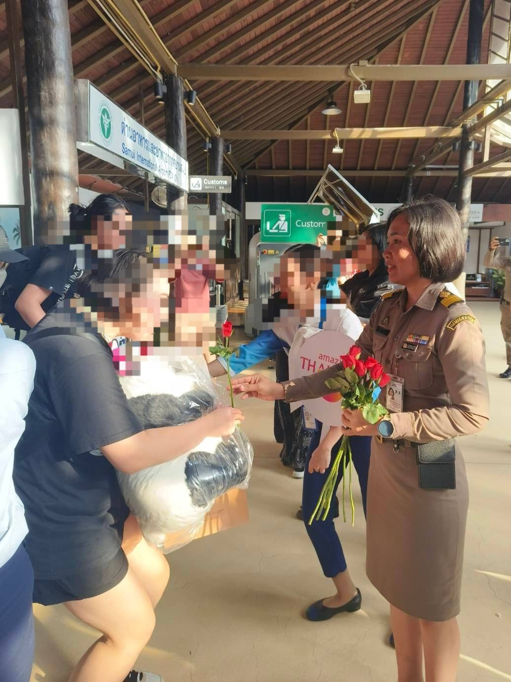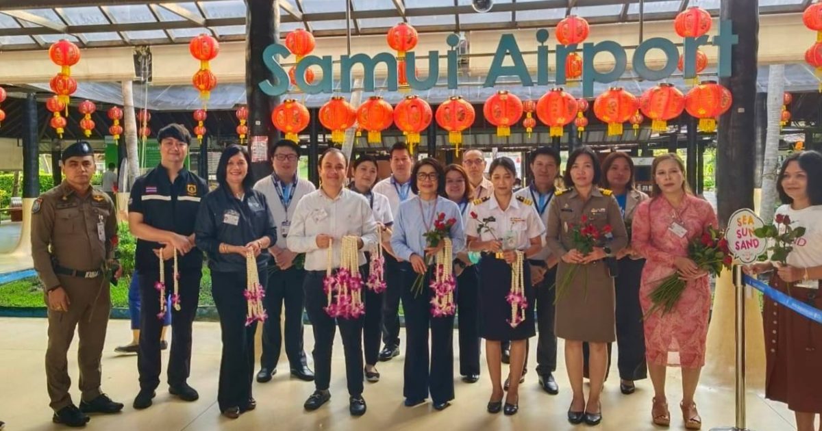 วันที่ 30 ม.ค.67 เวลา 08.00 น. ร.ต.อ.หญิง อลิตสรา วงษ์แก้ว รอง สว.ตม.จว.สุราษฎร์ธานี พร้อมด้วยเจ้าหน้าที่ ตม.จว.สุราษฎร์ธานี (ทอ.สมุย) ร่วมให้การต้อนรับการกลับมาของเที่ยวบินของสายการบินบางกอกแอร์เวย์ เส้นทาง จีน (เฉิงตู) – สมุย (เที่ยวบิน PG832 มีผู้โดยสาร 137 คน โดยมีคุณณัฎฐ์ชยธร ณัฐสุดานิจวิภา ผู้อำนวยการราชการสัมพันธ์และพัฒนาธุรกิจ สนามบินสมุย พร้อมด้วยหน่วยงานและส่วนงานต่างๆ ภายในสนามบินสมุยให้การตอนรับ ณ อาคารผู้โดยสารขาเข้าระหว่างประเทศ สนามบินสมุย