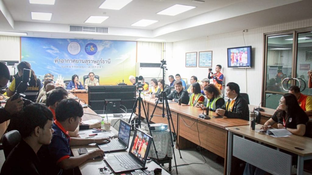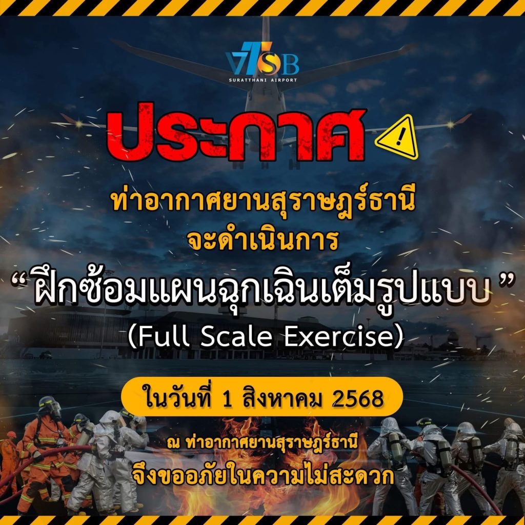 ร่วมฝึกซ้อมแผนฉุกเฉินท่าอากาศยานเต็มรูปแบบประจำปี 2568 ซึ่งเป็นไปตามข้อกำหนดขององค์กรการบินพลเรือนระหว่างประเทศ หรือ ICAO และสำนักงานการบินพลเรือนแห่งประเทศไทย โดยมี นางปรีดา ช่วยคง ผู้อำนวยการท่าอากาศยานสุราษฎร์ธานี นายสงบ สะโตน หัวหน้าสำนักงานป้องกันและบรรเทาสาธารณภัยจังหวัดสุราษฎร์ธานี ตลอดจนส่วนราชการเจ้าหน้าที่ที่เกี่ยวข้อง เข้าร่วมการฝึกซ้อม