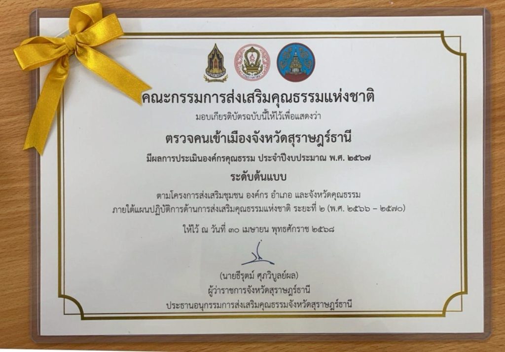 เป็นตัวแทนรับมอบเกียรติบัตรการประเมินองค์กรคุณธรรม ประจำปีงบประมาณ พ.ศ.2567 “ระดับต้นแบบ” ตามโครงการส่งเสริมชุมชน องค์กร อำเภอ และจังหวัดคุณธรรม ภายใด้แผนปฏิบัติการด้านการส่งสริมคุณธรรมแห่งชาติ ระยะที่ 2 (พ.ศ.2566-2570) จากคณะกรรมการส่งเสริมคุณธรรมแห่งชาติ