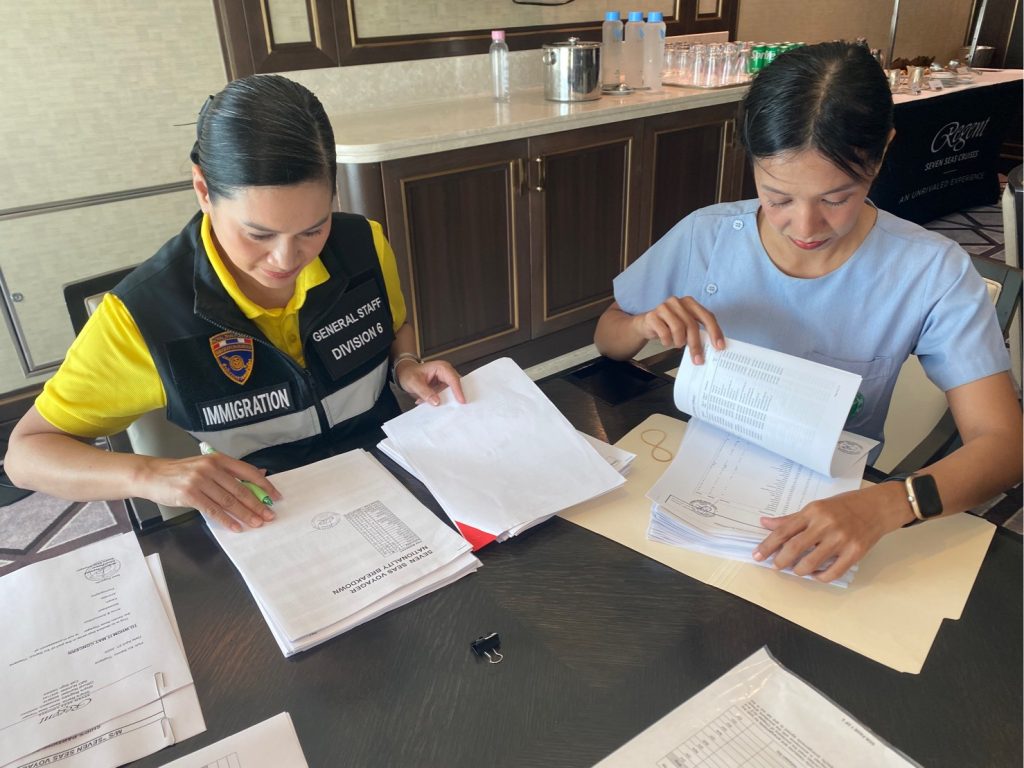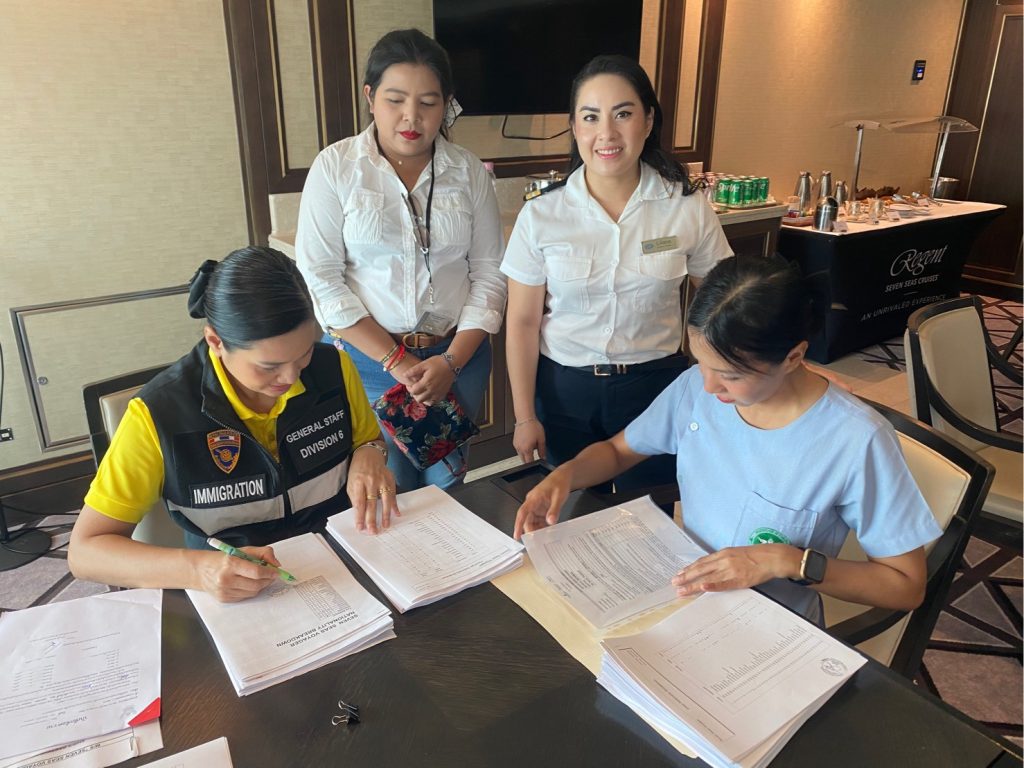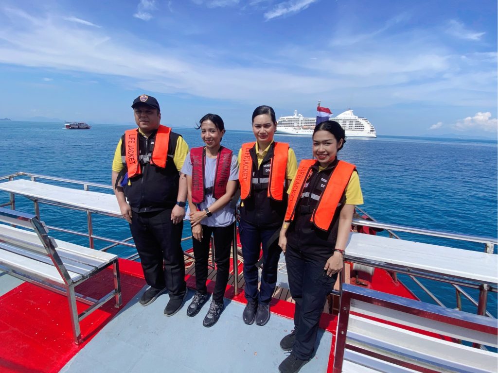ร.ต.อ.หญิง มนธีรา สนเลม็ด รอง สว.ตม.จว.สุราษฎร์ธานี, ส.ต.อ.อิมรอน คลานุรักษ์ ผบ.หมู่ ตม.จว.สุราษฎร์ธานี และ ส.ต.อ.หญิง บุษกร พรหมมินทร์ ผบ.หมู่ ตม.จว.สุราษฎร์ธานี ให้มาปฏิบัติหน้าที่ตรวจเรือสำราญ “m.v. SEVEN SEAS VOYAGER” ที่เดินทางมาจากแหลมฉบัง จว.ชลบุรี เพื่อนำนักท่องเที่ยวมาพักผ่อนในพื้นที่เกาะสมุย ณ ท่าเทียบเรือลมพระยาหน้าทอน ต.อ่างทอง อ.เกาะสมุย และเดินทางไปยังประเทศสิงคโปร์ ตั้งแต่เวลา 09.30 – 17.00 น.