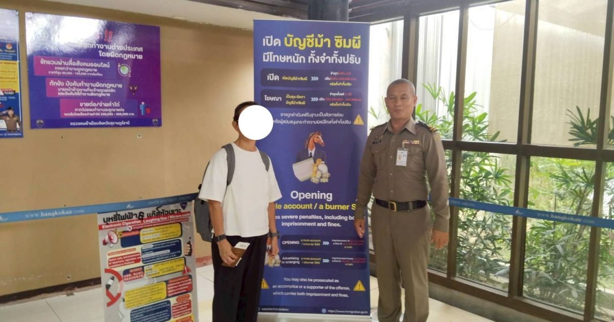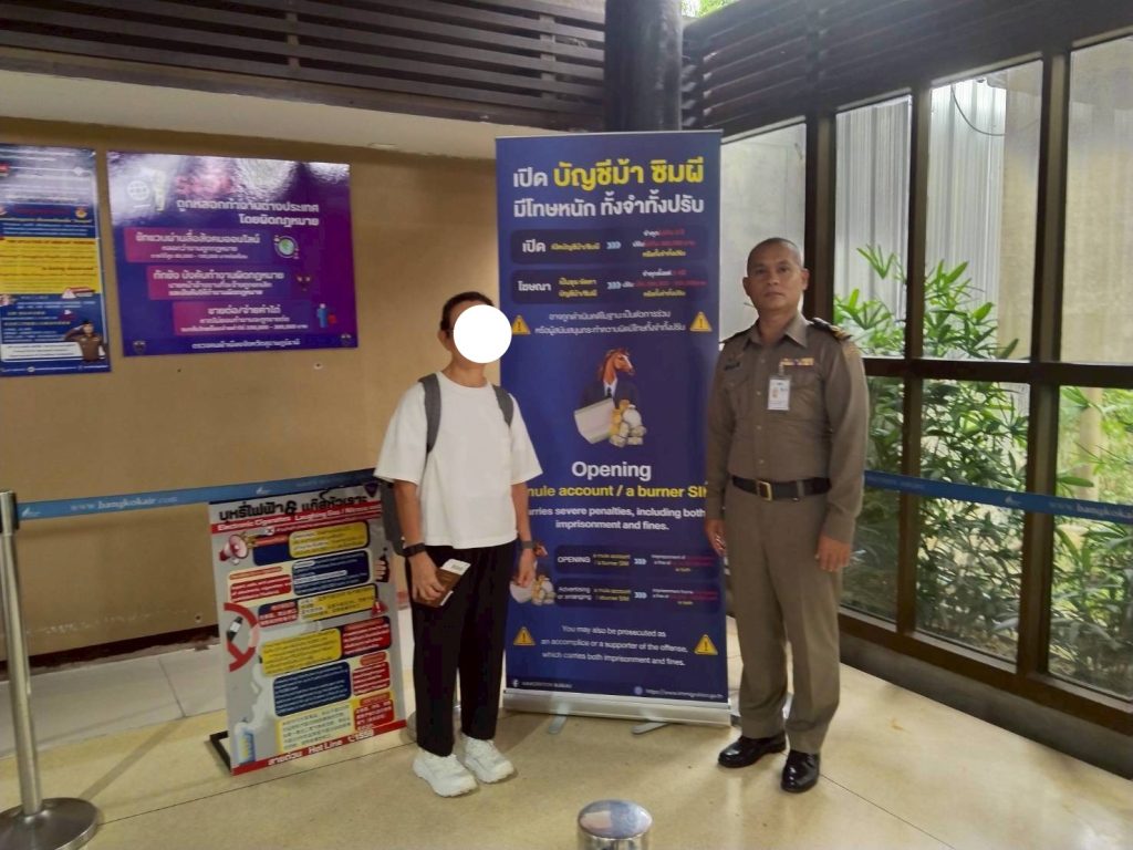 วันที่ 23/1/2569 ร.ต.อ.หญิง ภาวดี หวานทอง รอง สว.ตม.จว.สุราษฎร์ธานี พร้อมด้วยเจ้าหน้าที่ ตม.จว.สุราษฎร์ ธานี (ทอ.สมุย) ประชาสัมพันธ์ให้ผู้โดยสารคนไทยและต่างชาติ จำนวน 1 คน ได้รับทราบถึงโทษทางกฎหมายที่เกี่ยวข้องกับ สแกมเมอร์ ซิมผี/บัญชีม้า ในเขตพื้นที่รับผิดชอบประจำสนามบินสมุย