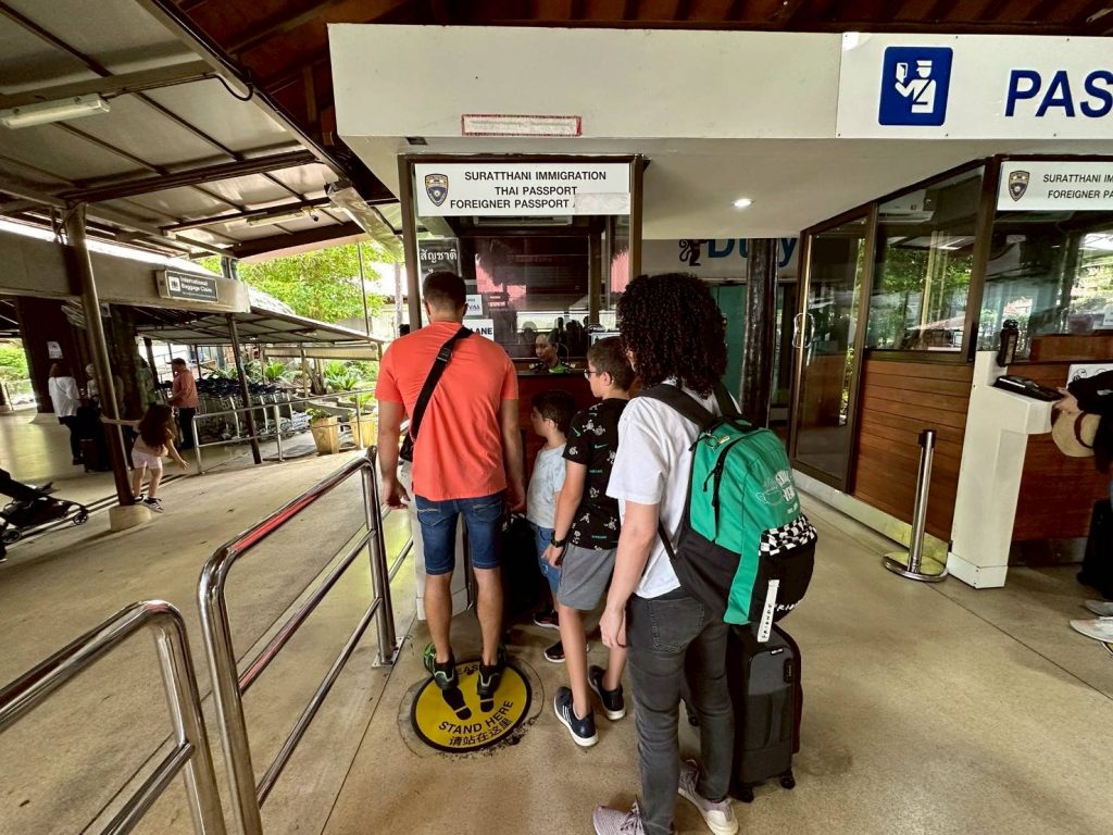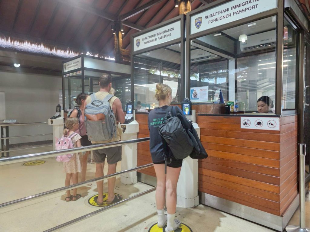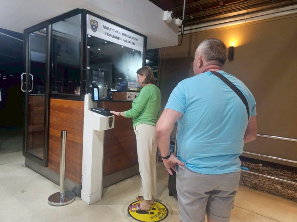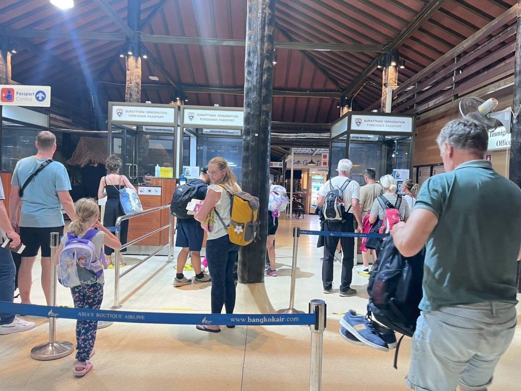 วันที่ 18 เม.ย.68 ร.ต.อ.หญิง ภาวดี หวานทอง ,ร.ต.อ.ธฤติพัฒน์ สมมะลวน,ร.ต.อ.หญิง จันทร์จิรา วิถี รอง สว.ตม. จว.สุราษฎร์ธานี พร้อมด้วยเจ้าหน้าที่ ตม.จว. สุราษฎร์ธานี (ทอ.สมุย) ปฏิบัติหน้าที่ตรวจบุุคคลและพาหนะทางอากาศ, Overstay, Visa on arrival พร้อมดูแล ช่วยเหลือ อำนวยความสะดวกและความเรียบร้อยในแถวระหว่างรอเข้าใช้บริการให้กับผู้โดยสารที่เดินทางเข้า-ออก ทางอากาศในเขตพื้นที่รับผิดชอบประจำสนามบินสมุย อ.เกาะสมุย จว.สุราษฎร์ธานี