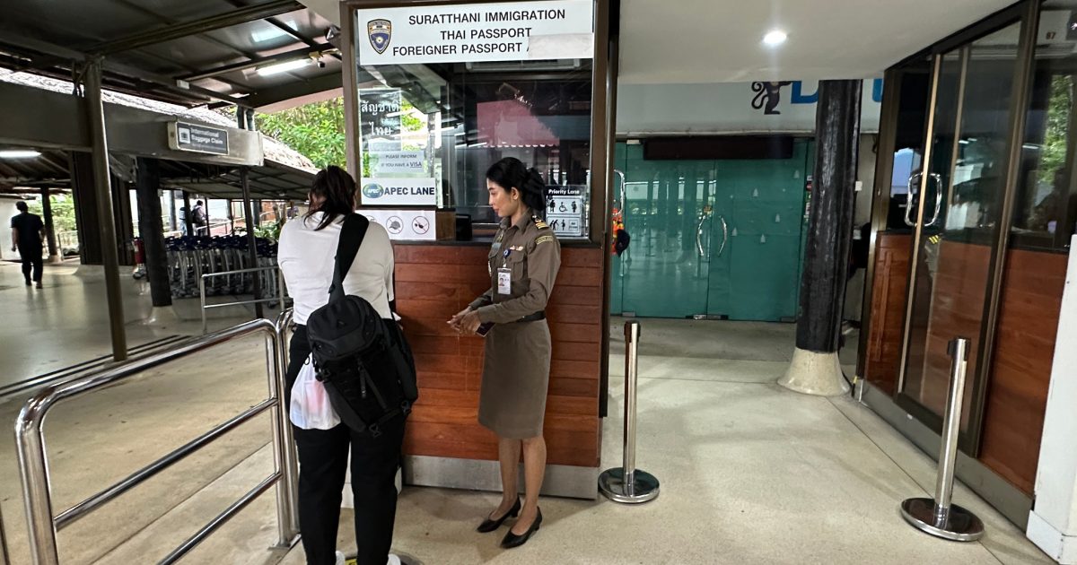วันที่ 20 ธ.ค.67 ร.ต.อ.ปิติพงษ์ เสนชู รอง สว.ตม.จว.สุราษฎร์ธานี ,ร.ต.อ.หญิง ภาวดี หวานทอง ,ร.ต.อ.หญิง จันทร์จิรา วิถี พร้อมด้วยเจ้าหน้าที่ ตม.จว.สุราษฎร์ธานี (ทอ.สมุย) ปฏิบัติหน้าที่ตรวจบุุคคลและพาหนะทางอากาศ, Overstay, Visa on arrival พร้อมดูแล ช่วยเหลือ อำนวยความสะดวกและความเรียบร้อยในแถวระหว่างรอเข้าใช้บริการให้กับผู้โดยสารที่เดินทางเข้า-ออก ทางอากาศในเขตพื้นที่รับผิดชอบประจำสนามบินสมุย อ.เกาะสมุย จว.สุราษฎร์ธานี