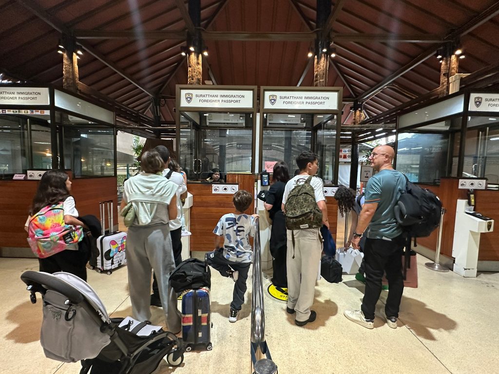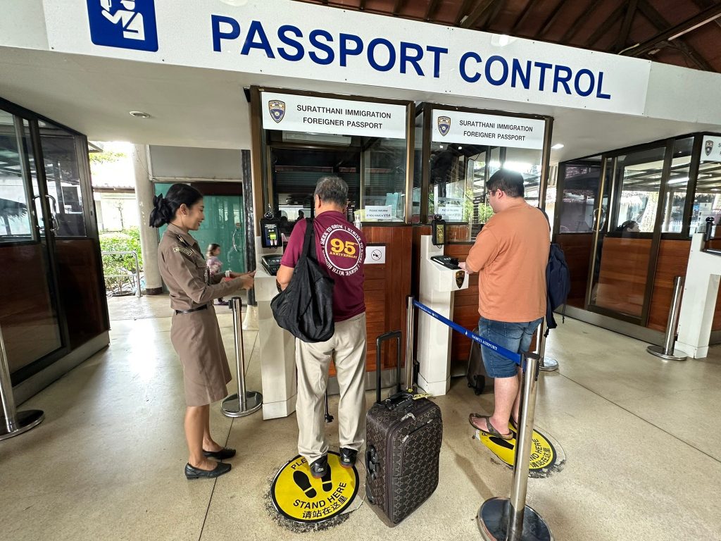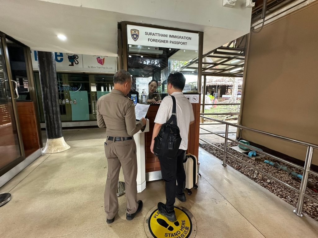 วันที่ 25 ก.พ.68 ร.ต.อ.ปิติพงษ์ เสนชู รอง สว.ตม.จว.สุราษฎร์ธานี ,ร.ต.อ.หญิง ภาวดี หวานทอง ,ร.ต.อ.หญิง จันทร์จิรา วิถี พร้อมด้วยเจ้าหน้าที่ ตม.จว.สุราษฎร์ธานี (ทอ.สมุย) ปฏิบัติหน้าที่ตรวจบุคคลและพาหนะทางอากาศ, Overstay, Visa on arrival พร้อมดูแล ช่วยเหลือ อำนวยความสะดวกและความเรียบร้อยในแถวระหว่างรอเข้าใช้บริการให้กับผู้โดยสารที่เดินทางเข้า-ออก ทางอากาศในเขตพื้นที่รับผิดชอบประจำสนามบินสมุย อ.เกาะสมุย จว.สุราษฎร์ธานี