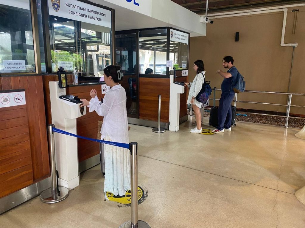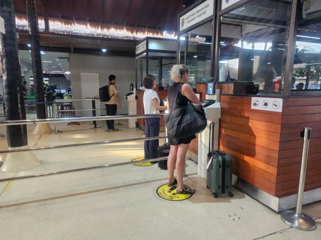 วันที่ 21 ก.พ.68 ร.ต.อ.ปิติพงษ์ เสนชู ,ร.ต.อ.หญิง ภาวดี หวานทอง ,ร.ต.อ.หญิง จันทร์จิรา วิถี รอง สว.ตม. จว.สุราษฎร์ธานี พร้อมด้วยเจ้าหน้าที่ ตม.จว. สุราษฎร์ธานี (ทอ.สมุย) ปฏิบัติหน้าที่ตรวจบุุคคลและพาหนะทางอากาศ, Overstay, Visa on arrival พร้อมดูแล ช่วยเหลือ อำนวยความสะดวกและความเรียบร้อยในแถวระหว่างรอเข้าใช้บริการให้กับผู้โดยสารที่เดินทางเข้า-ออก ทางอากาศในเขตพื้นที่รับผิดชอบประจำสนามบินสมุย อ.เกาะสมุย จว.สุราษฎร์ธานี