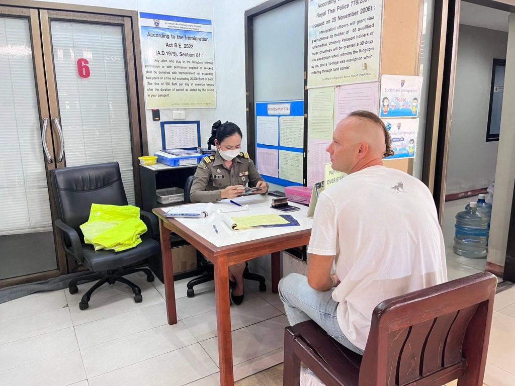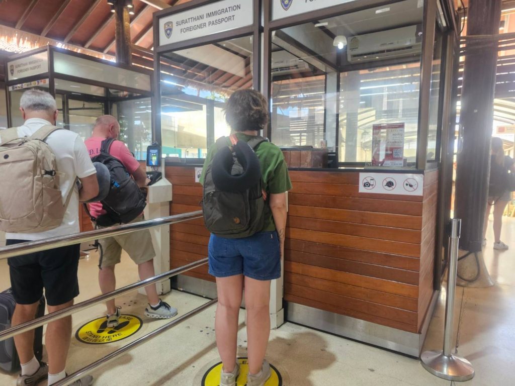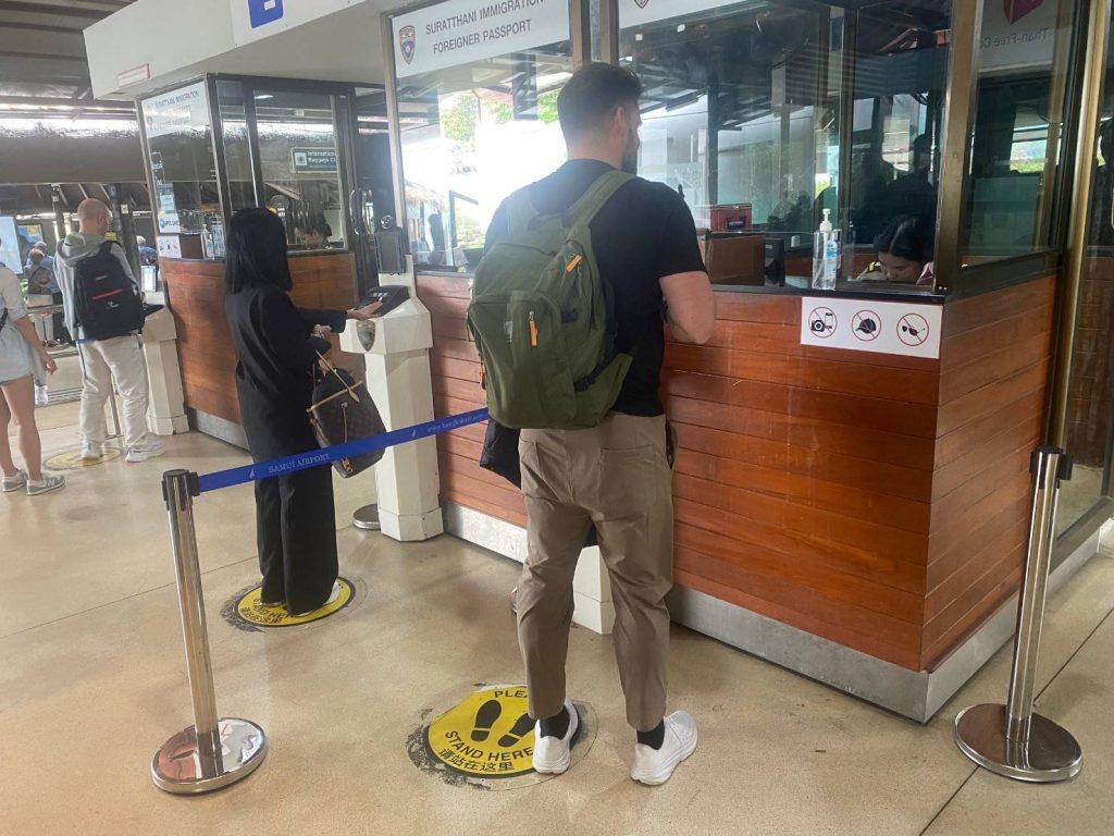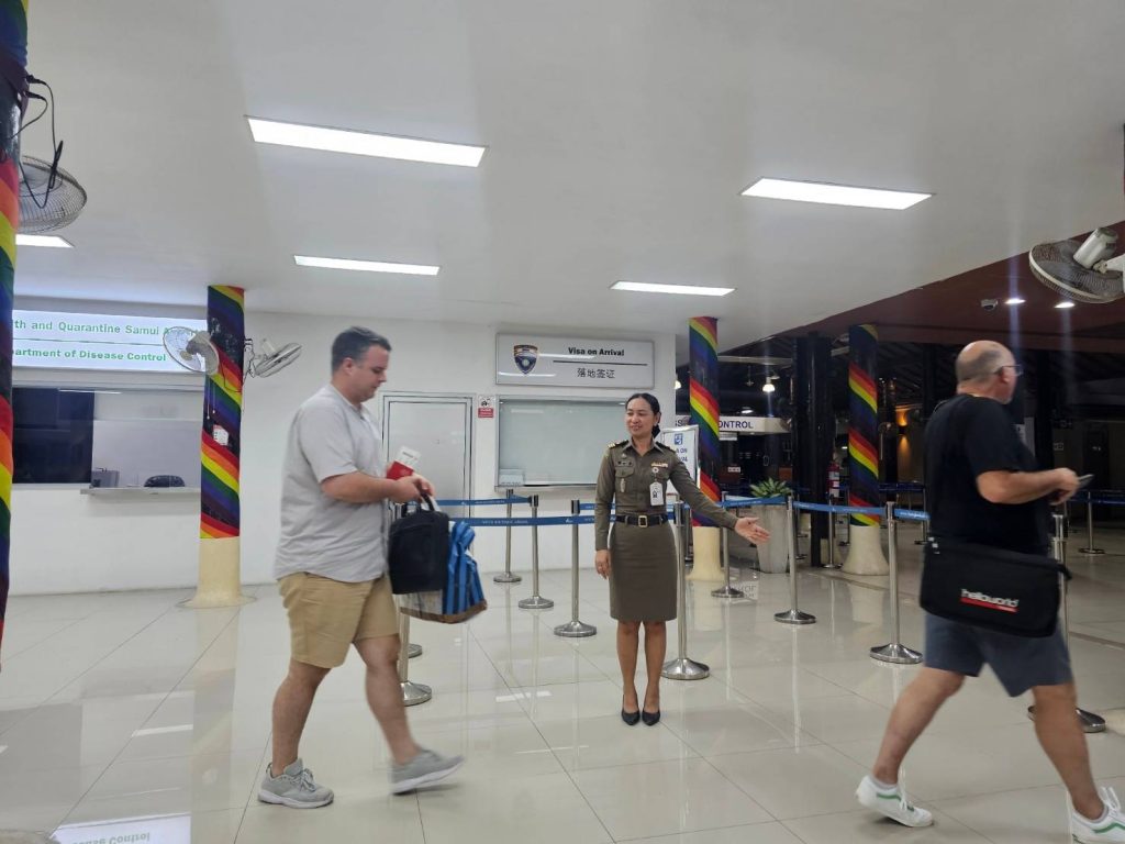 วันที่ 6 ก.พ.68 ร.ต.อ.ปิติพงษ์ เสนชู ,ร.ต.อ.หญิง ภาวดี หวานทอง ,ร.ต.อ.หญิง จันทร์จิรา วิถี รอง สว.ตม. จว.สุราษฎร์ธานี พร้อมด้วยเจ้าหน้าที่ ตม.จว. สุราษฎร์ธานี (ทอ.สมุย) ปฏิบัติหน้าที่ตรวจบุุคคลและพาหนะทางอากาศ, Overstay, Visa on arrival พร้อมดูแล ช่วยเหลือ อำนวยความสะดวกและความเรียบร้อยในแถวระหว่างรอเข้าใช้บริการให้กับผู้โดยสารที่เดินทางเข้า-ออก ทางอากาศในเขตพื้นที่รับผิดชอบประจำสนามบินสมุย อ.เกาะสมุย จว.สุราษฎร์ธานี