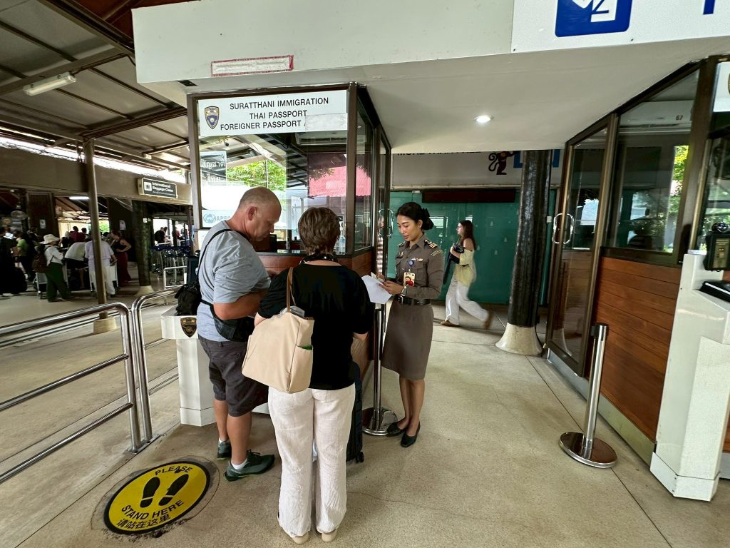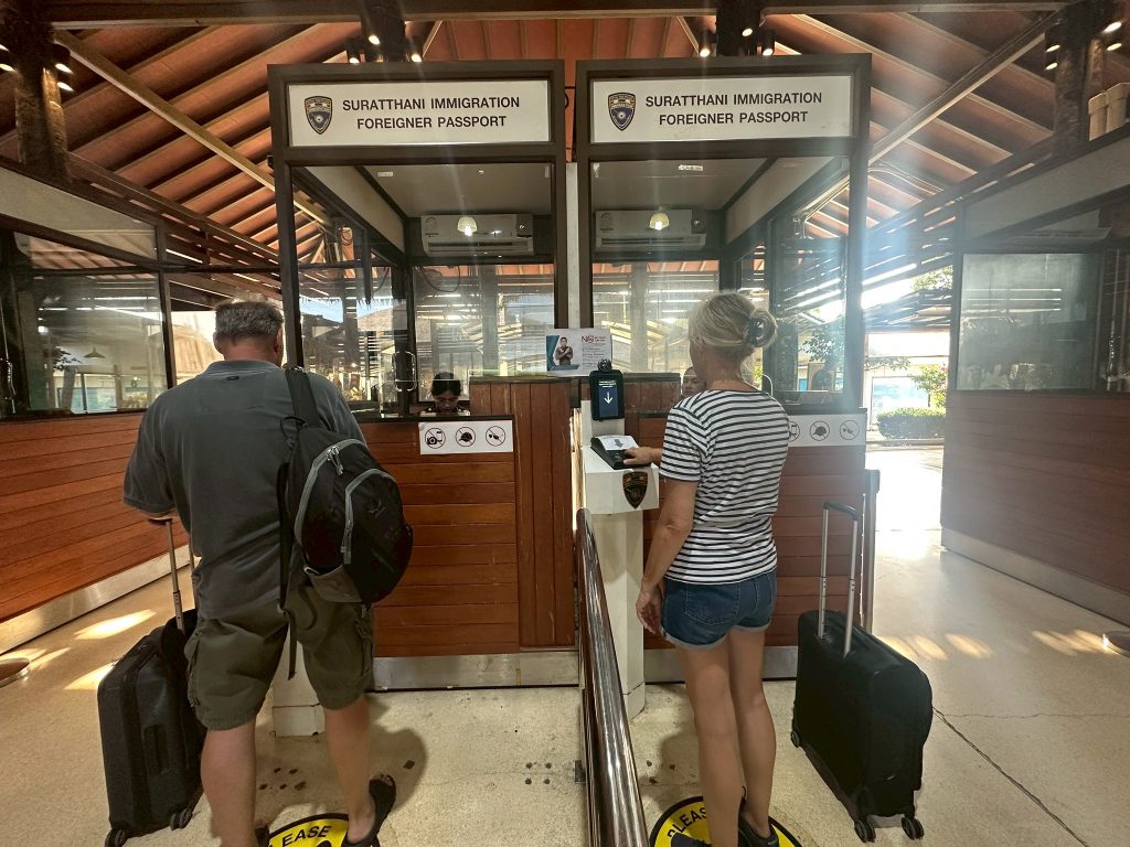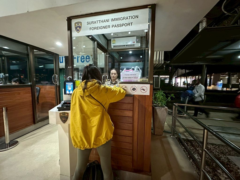 วันที่ 9 เม.ย.68 ร.ต.อ.ธฤติพัฒน์ สมมะลวน รอง สว.ตม.จว.สุราษฎร์ธานี ,ร.ต.อ.หญิง ภาวดี หวานทอง ,ร.ต.อ.หญิง จันทร์จิรา วิถี พร้อมด้วยเจ้าหน้าที่ ตม.จว.สุราษฎร์ธานี (ทอ.สมุย) ปฏิบัติหน้าที่ตรวจบุคคลและพาหนะทางอากาศ, Overstay, Visa on arrival พร้อมดูแล ช่วยเหลือ อำนวยความสะดวกและความเรียบร้อยในแถวระหว่างรอเข้าใช้บริการให้กับผู้โดยสารที่เดินทางเข้า-ออก ทางอากาศในเขตพื้นที่รับผิดชอบประจำสนามบินสมุย อ.เกาะสมุย จว.สุราษฎร์ธานี