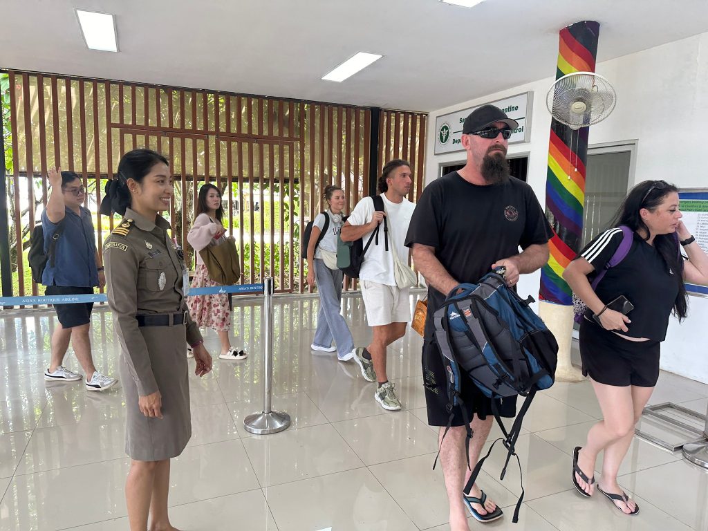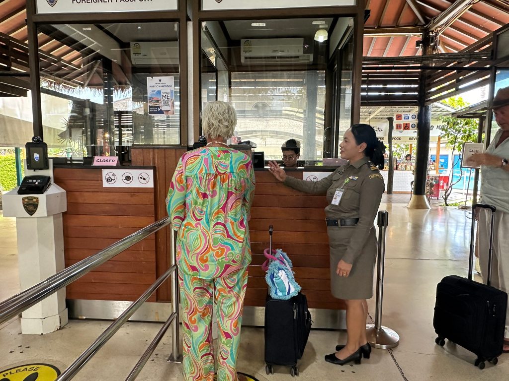 วันที่ 31 ต.ค.67 ร.ต.อ.ปิติพงษ์ เสนชู รอง สว.ตม.จว.สุราษฎร์ธานี ,ร.ต.อ.หญิง ภาวดี หวานทอง ,ร.ต.อ.หญิง จันทร์จิรา วิถี พร้อมด้วยเจ้าหน้าที่ ตม.จว.สุราษฎร์ธานี (ทอ.สมุย) ปฏิบัติหน้าที่ตรวจบุุคคลและพาหนะทางอากาศ, Overstay, Visa on arrival พร้อมดูแล ช่วยเหลือ อำนวยความสะดวกและความเรียบร้อยในแถวระหว่างรอเข้าใช้บริการให้กับผู้โดยสารที่เดินทางเข้า-ออก ทางอากาศในเขตพื้นที่รับผิดชอบประจำสนามบินสมุย อ.เกาะสมุย จว.สุราษฎร์ธานี