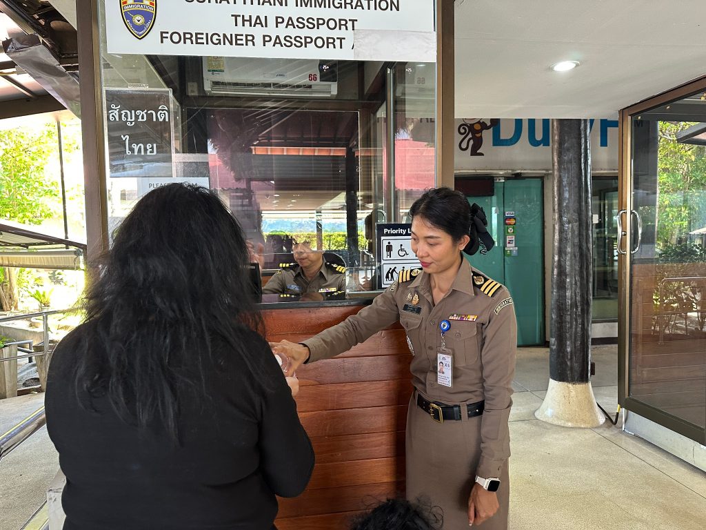 วันที่ 16 พ.ย.67 ร.ต.อ.ปิติพงษ์ เสนชู รอง สว.ตม.จว.สุราษฎร์ธานี ,ร.ต.อ.หญิง ภาวดี หวานทอง ,ร.ต.อ.หญิง จันทร์จิรา วิถี พร้อมด้วยเจ้าหน้าที่ ตม.จว.สุราษฎร์ธานี (ทอ.สมุย) ปฏิบัติหน้าที่ตรวจบุุคคลและพาหนะทางอากาศ, Overstay, Visa on arrival พร้อมดูแล ช่วยเหลือ อำนวยความสะดวกและความเรียบร้อยในแถวระหว่างรอเข้าใช้บริการให้กับผู้โดยสารที่เดินทางเข้า-ออก ทางอากาศในเขตพื้นที่รับผิดชอบประจำสนามบินสมุย อ.เกาะสมุย จว.สุราษฎร์ธานี