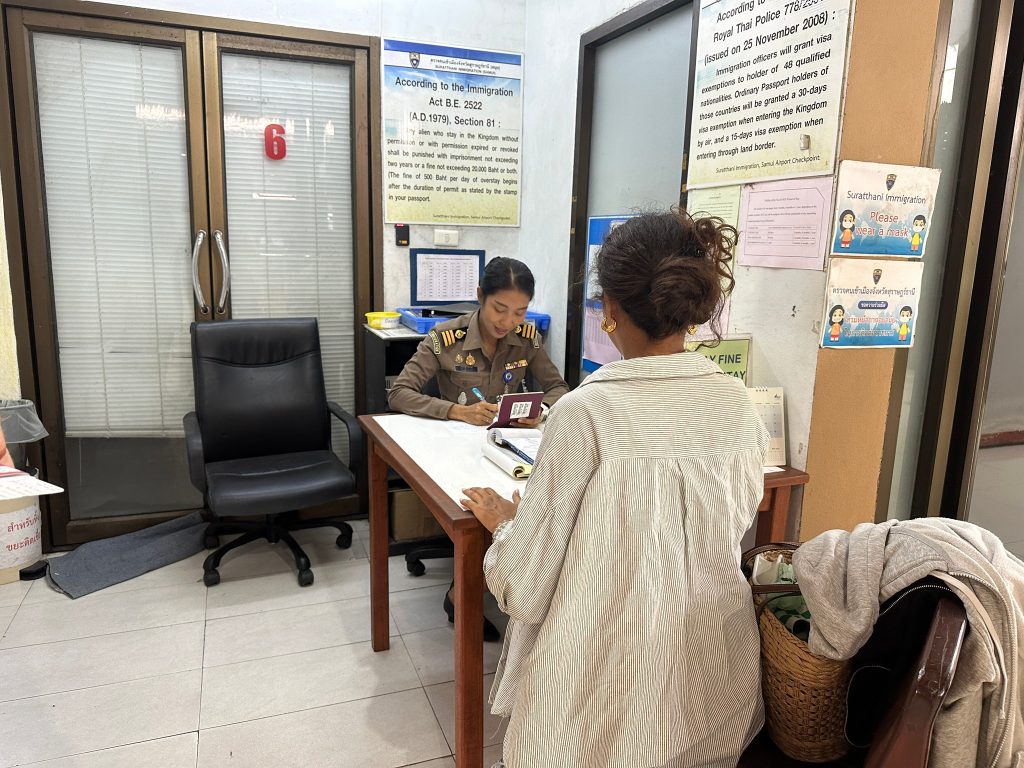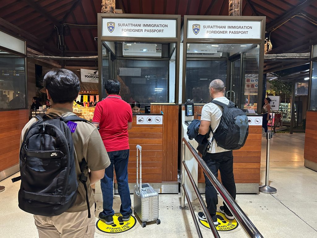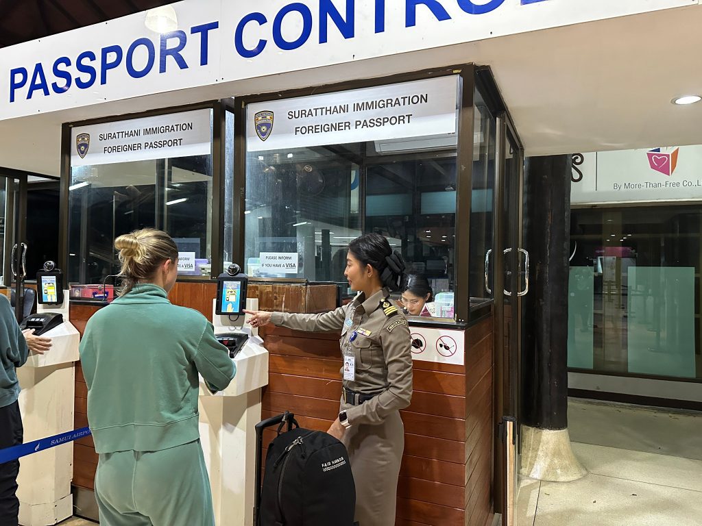 วันที่ 22 พ.ย.67 ร.ต.อ.ปิติพงษ์ เสนชู รอง สว.ตม.จว.สุราษฎร์ธานี ,ร.ต.อ.หญิง ภาวดี หวานทอง ,ร.ต.อ.หญิง จันทร์จิรา วิถี พร้อมด้วยเจ้าหน้าที่ ตม.จว.สุราษฎร์ธานี (ทอ.สมุย) ปฏิบัติหน้าที่ตรวจบุุคคลและพาหนะทางอากาศ, Overstay, Visa on arrival พร้อมดูแล ช่วยเหลือ อำนวยความสะดวกและความเรียบร้อยในแถวระหว่างรอเข้าใช้บริการให้กับผู้โดยสารที่เดินทางเข้า-ออก ทางอากาศในเขตพื้นที่รับผิดชอบประจำสนามบินสมุย อ.เกาะสมุย จว.สุราษฎร์ธานี