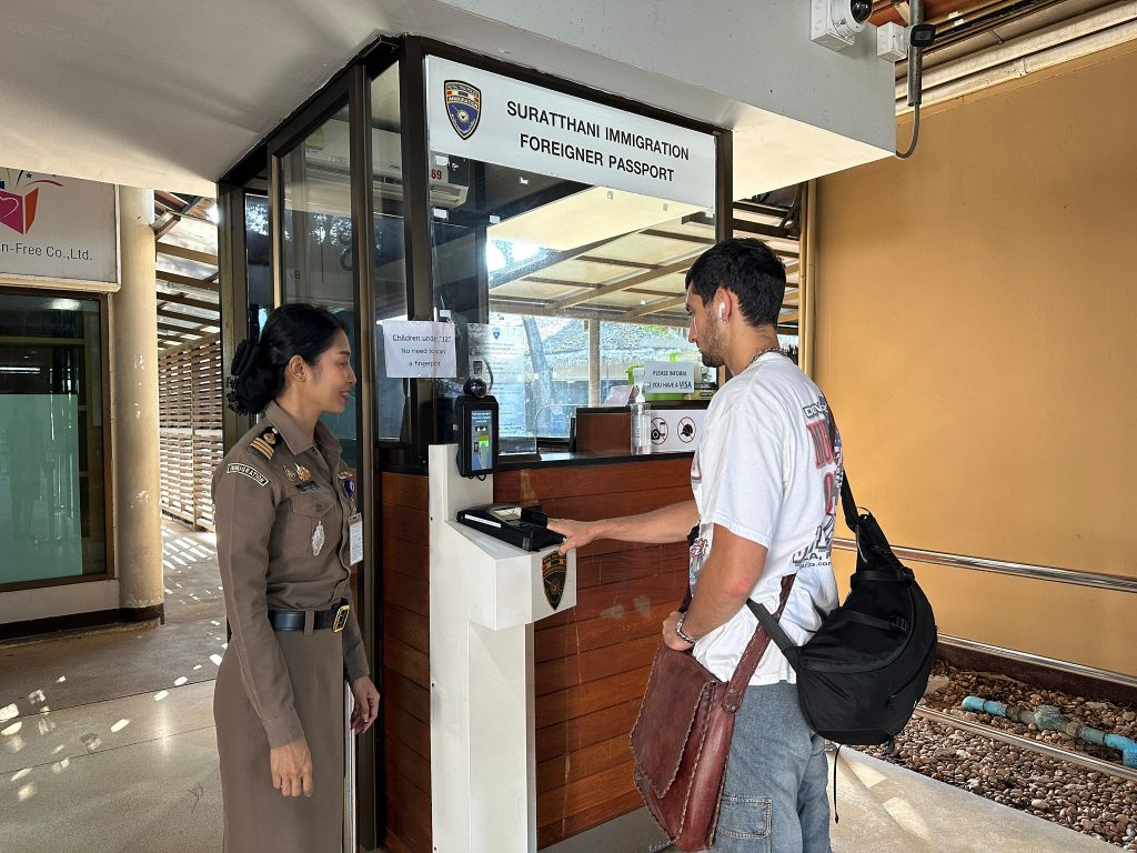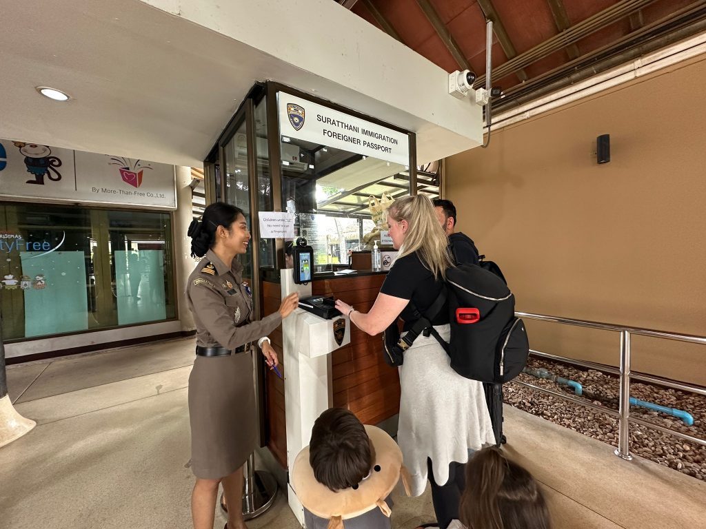 วันที่ 26 พ.ย.67 ร.ต.อ.ปิติพงษ์ เสนชู รอง สว.ตม.จว.สุราษฎร์ธานี ,ร.ต.อ.หญิง ภาวดี หวานทอง ,ร.ต.อ.หญิง จันทร์จิรา วิถี พร้อมด้วยเจ้าหน้าที่ ตม.จว.สุราษฎร์ธานี (ทอ.สมุย) ปฏิบัติหน้าที่ตรวจบุุคคลและพาหนะทางอากาศ, Overstay, Visa on arrival พร้อมดูแล ช่วยเหลือ อำนวยความสะดวกและความเรียบร้อยในแถวระหว่างรอเข้าใช้บริการให้กับผู้โดยสารที่เดินทางเข้า-ออก ทางอากาศในเขตพื้นที่รับผิดชอบประจำสนามบินสมุย อ.เกาะสมุย จว.สุราษฎร์ธานี
