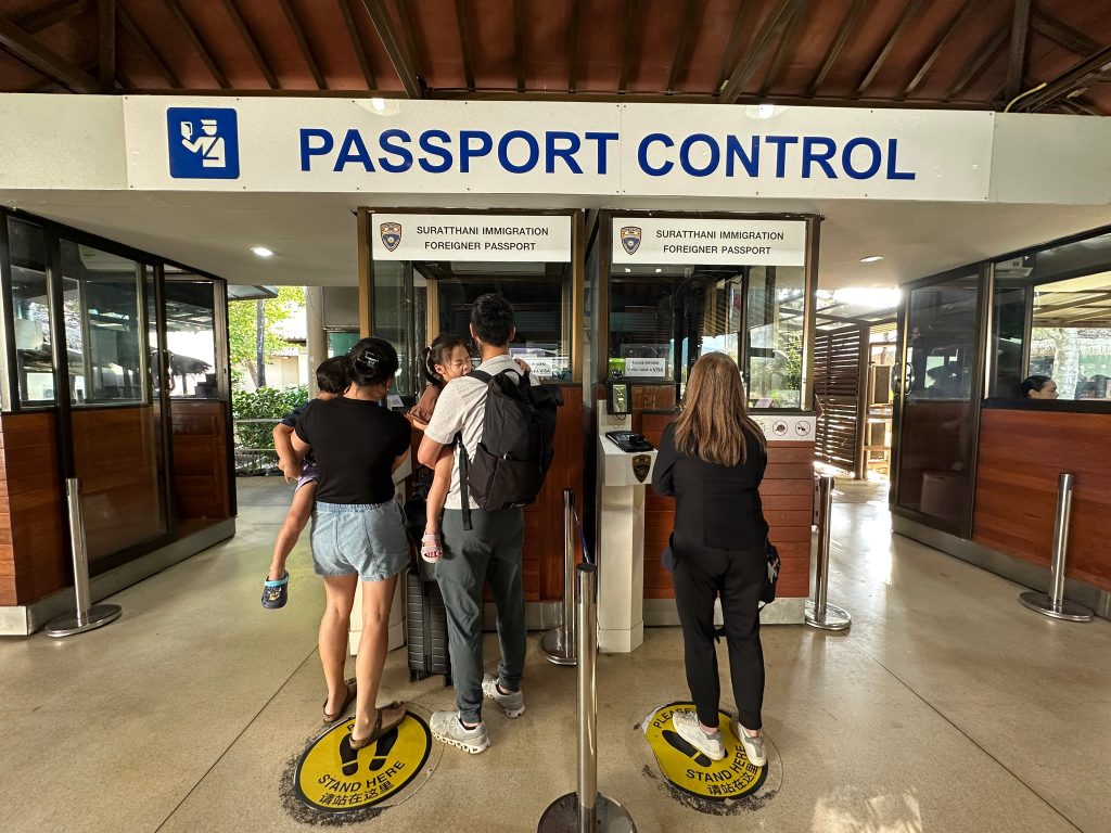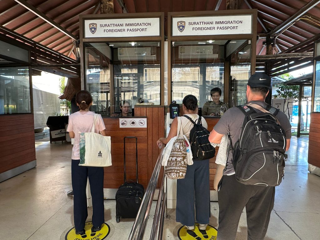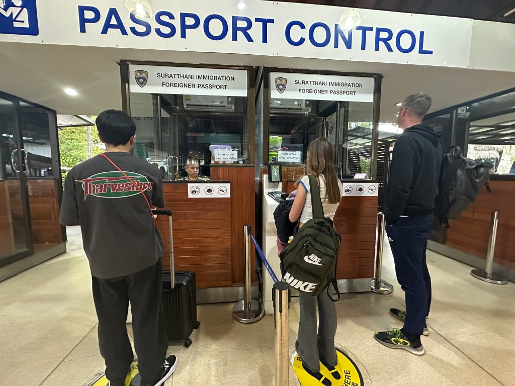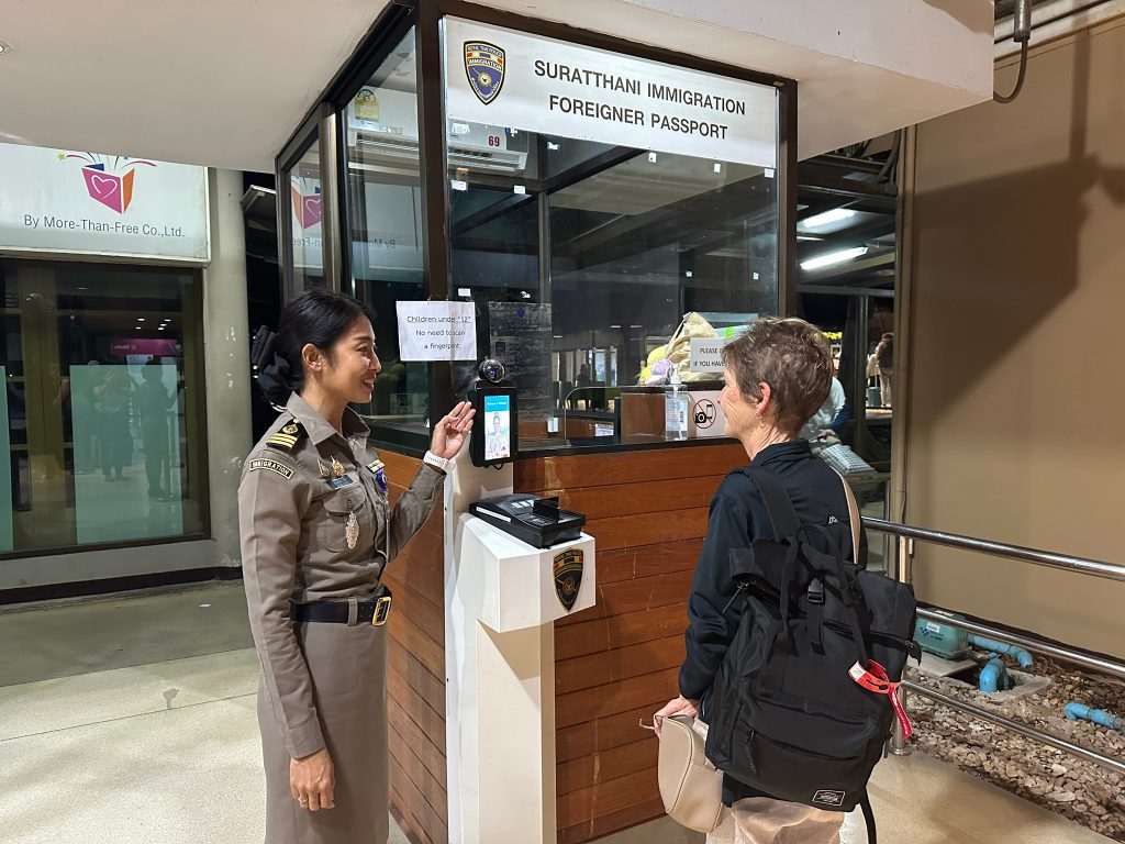 วันที่ 30 พ.ย.67 ร.ต.อ.ปิติพงษ์ เสนชู รอง สว.ตม.จว.สุราษฎร์ธานี ,ร.ต.อ.หญิง ภาวดี หวานทอง ,ร.ต.อ.หญิง จันทร์จิรา วิถี พร้อมด้วยเจ้าหน้าที่ ตม.จว.สุราษฎร์ธานี (ทอ.สมุย) ปฏิบัติหน้าที่ตรวจบุุคคลและพาหนะทางอากาศ, Overstay, Visa on arrival พร้อมดูแล ช่วยเหลือ อำนวยความสะดวกและความเรียบร้อยในแถวระหว่างรอเข้าใช้บริการให้กับผู้โดยสารที่เดินทางเข้า-ออก ทางอากาศในเขตพื้นที่รับผิดชอบประจำสนามบินสมุย อ.เกาะสมุย จว.สุราษฎร์ธานี