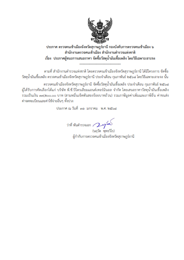 ประกาศผู้ชนะการเสนอราคา จัดซื้อวัสดุน้ำมันเชื้อเพลิง โดยวิธีเฉพาะเจาะจง ของ ตม.จว.สุราษฎร์ธานี เดือน กุมภาพันธ์ พ.ศ.2568