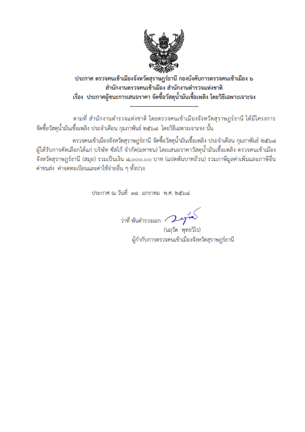 ประกาศผู้ชนะการเสนอราคา จัดซื้อวัสดุน้ำมันเชื้อเพลิง โดยวิธีเฉพาะเจาะจง ของ ตม.จว.สุราษฎร์ธานี (สมุย) เดือน กุมภาพันธ์ พ.ศ.2568