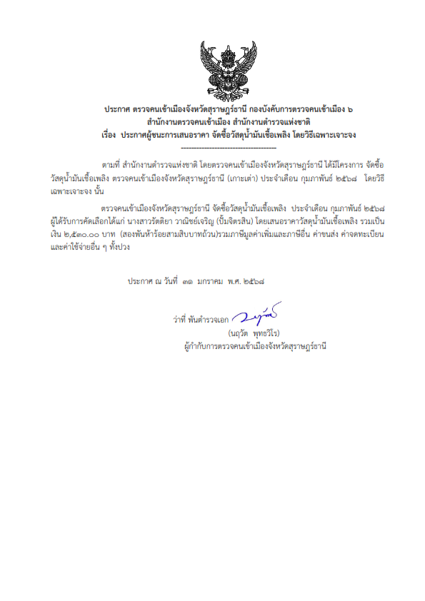 ประกาศผู้ชนะการเสนอราคา จัดซื้อวัสดุน้ำมันเชื้อเพลิง โดยวิธีเฉพาะเจาะจง ของ ตม.จว.สุราษฎร์ธานี (เกาะเต่า) เดือน กุมภาพันธ์ พ.ศ.2568