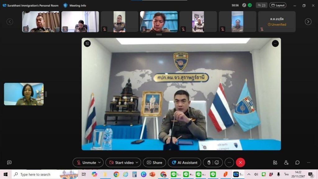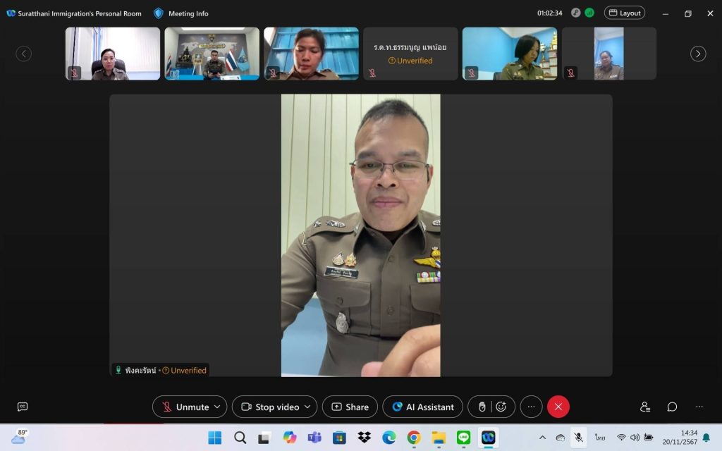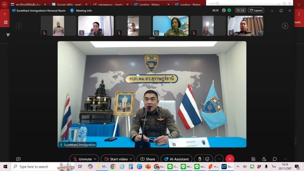 วันที่ 20 พ.ย.67 เวลา 14.00 น. ว่าที่ พ.ต.อ.นฤวัต พุทธวิโร ผกก.ตม.จว.สุราษฎร์ธานี พร้อมด้วยข้าราชการตำรวจในสังกัดฯ เข้าร่วมประชุมบริหาร ตม.จว.สุราษฎร์ธานี ครั้งที่ 11/2567 ผ่านระบบทางไกลผ่านจอภาพ Webex Meet โดยได้กำชับการปฏิบัติหน้าที่ของทุกฝ่ายให้เป็นไปอย่างรอบคอบ ฉับไว และรักษาระเบียบวินัย รวมถึงดำเนินการตามนโยบายของผู้บังคับบัญชาอย่างเคร่งครัด ณ ห้องประชุม ศปก.ตม.จว.สุราษฎร์ธานี (สมุย) ต.แม่น้ำ อ.เกาะสมุย จว.สุราษฎร์ธานี
