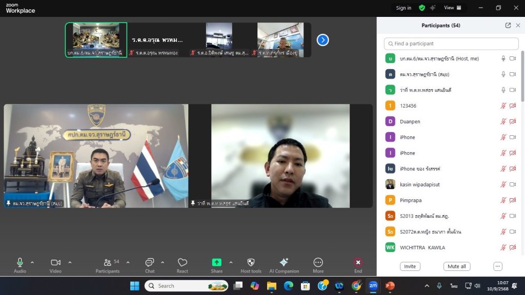 ณ ห้องประชุม ศปก.ตม.จว.สุราษฎร์ธานี และผ่านระบบการประชุมทางไกลผ่านจอภาพ ระบบ Zoom