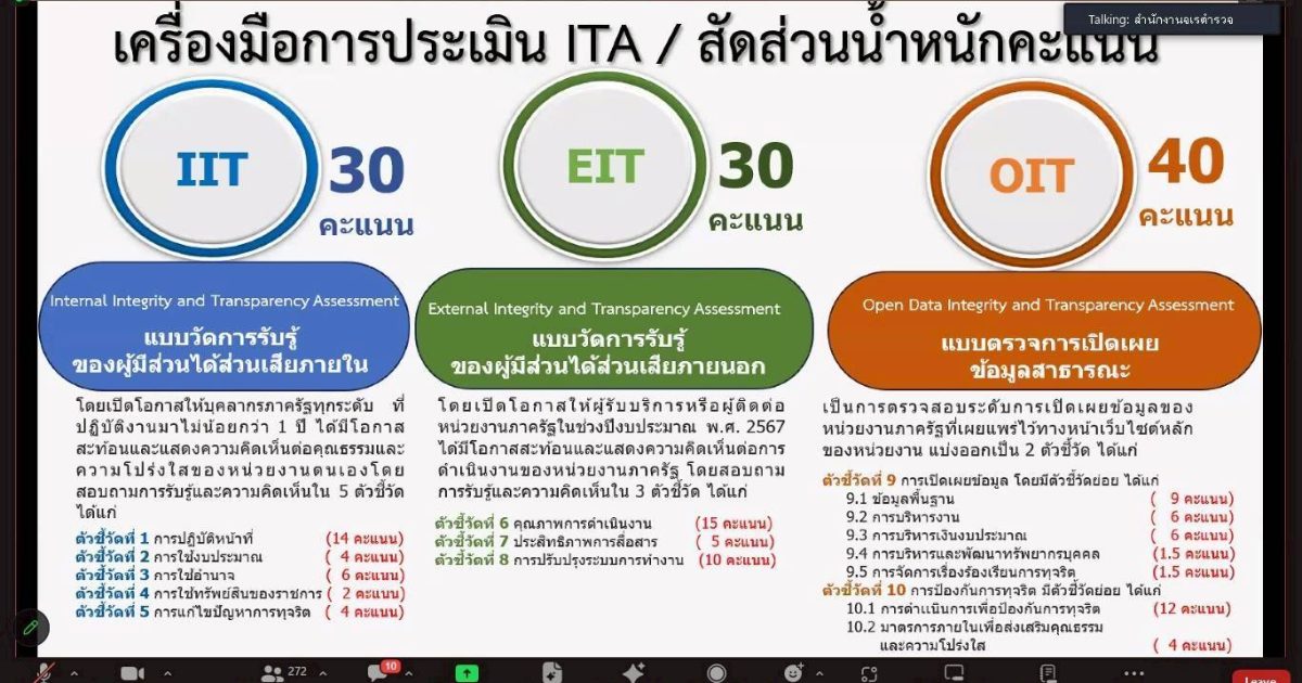 ร่วมประชุมเพื่อชี้แจงทำความเข้าใจเกี่ยวกับการปฏิบัติและข้อคำถามตามแบบวัด IIT และ EIT ของการประเมินคุณธรรมและความโปร่งใสในการดำเนินงานของหน่วยงานภาครัฐ ระดับกรมขึ้นไป (ตร.) (ITAS)