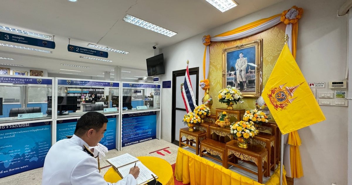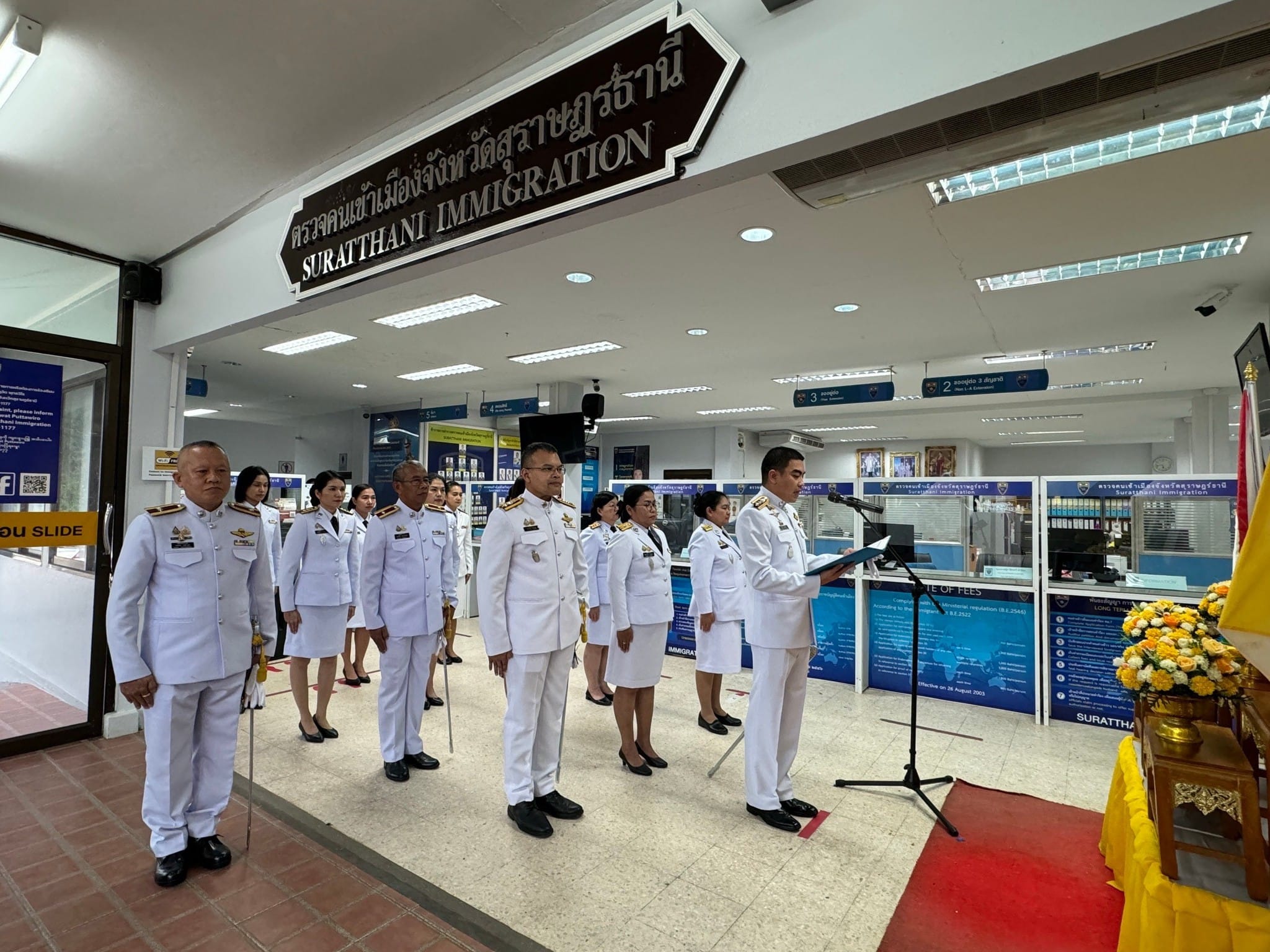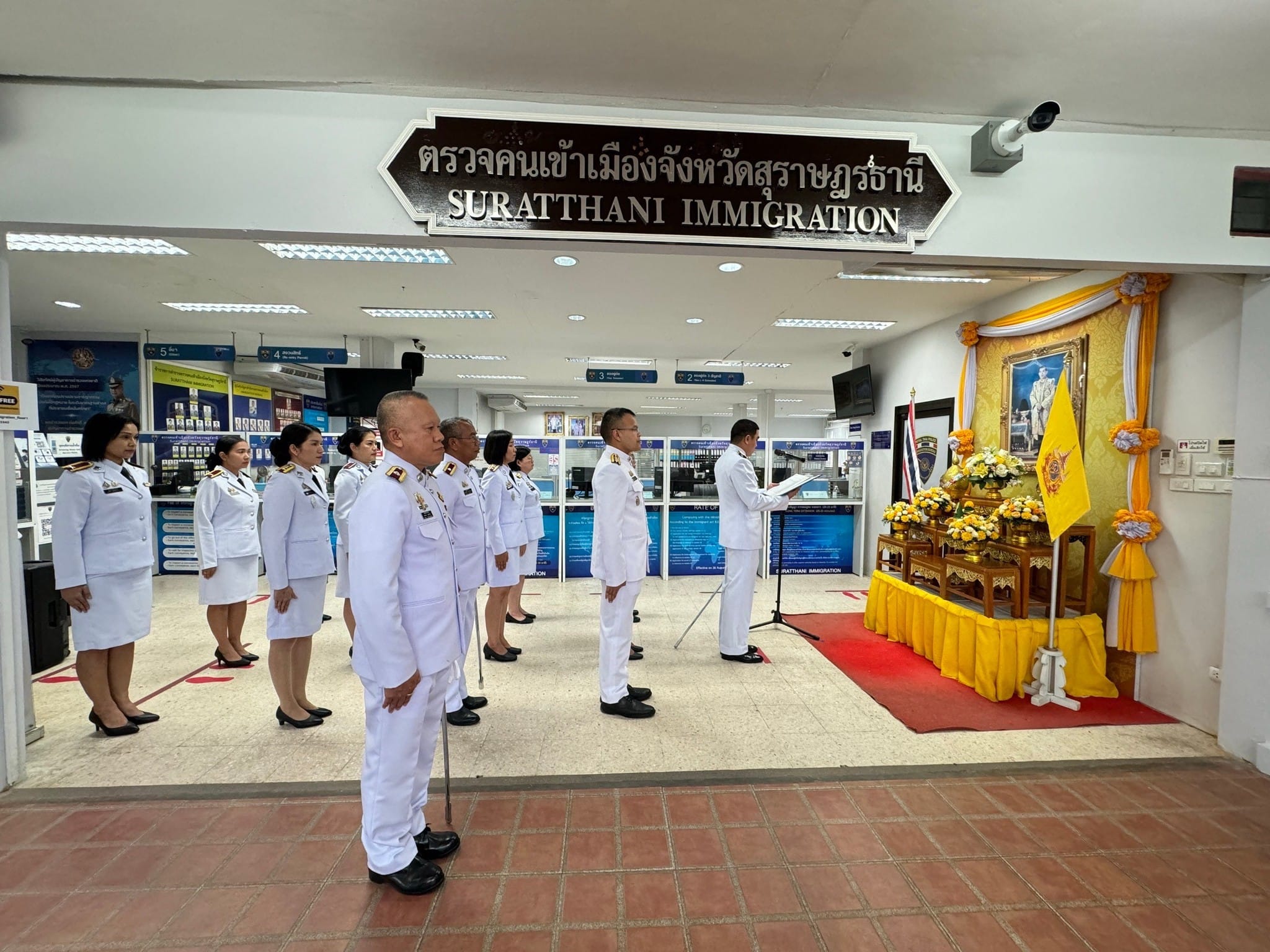 ตรวจคนเข้าเมืองจังหวัดสุราษฎร์ธานี จัดพิธีถวายพระพรชัยมงคล พิธีถวายสัตย์ปฏิญาณเพื่อเป็นข้าราชการที่ดีและพลังของแผ่นดิน และพิธีลงนามถวายพระพร เนื่องในโอกาสพระราชพิธีมหามงคลเฉลิมพระชนมพรรษาครบ 6 รอบ 28 กรกฎาคม 2567 ณ อาคารที่ทำการตรวจคนเข้าเมืองจังหวัดสุราษฎร์ธานี เมื่อวันที่ 26 กรกฎาคม 2567
