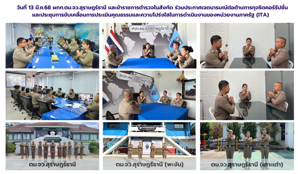 ผกก.ตม.จว.สุราษฎร์ธานี และข้าราชการตำรวจในสังกัด ร่วมประกาศเจตนารมณ์ต่อต้านการทุจริตคอร์รัปชั่นและประชุมการขับเคลื่อนการประเมินคุณธรรมและความโปร่งใสในการดำเนินงานของหน่วยงานภาครัฐ (ITA)