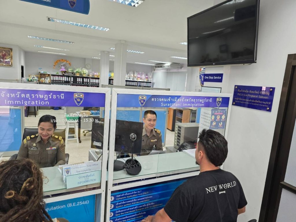 ช่วงวันที่ 21 เม.ย. 2568 ถึง 25 เม.ย.2568 เจ้าหน้าที่งานบริการคนเข้าเมือง ตม.จว.สุราษฎร์ธานี ได้ให้บริการขออยู่ต่อ (ระยะสั้น ระยะยาว แรงงานต่างด้าว 4 สัญชาติ) ,การแจ้งอยู่เกินกว่า 90 วัน ,RE-ENTRY
