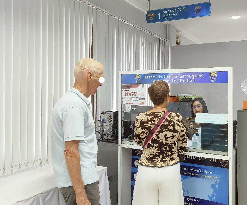 เจ้าหน้าที่งานบริการคนเข้าเมือง ตม.จว.สุราษฎร์ธานี ได้ประชาสัมพันธ์การรายงานตัว 90 วัน , การแจ้งที่พักอาศัยฯ และแนะนำเอกสารประกอบคำร้องขอยู่ต่อฯ รวมถึงการแจ้งเบาะแสอาชญากรรมต่างๆ แก่คนต่างด้าวที่เข้ามารับบริการ