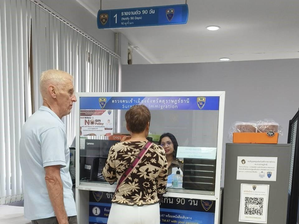 เจ้าหน้าที่งานบริการคนเข้าเมือง ตม.จว.สุราษฎร์ธานี ได้ประชาสัมพันธ์การรายงานตัว 90 วัน , การแจ้งที่พักอาศัยฯ และแนะนำเอกสารประกอบคำร้องขอยู่ต่อฯ รวมถึงการแจ้งเบาะแสอาชญากรรมต่างๆ แก่คนต่างด้าวที่เข้ามารับบริการ