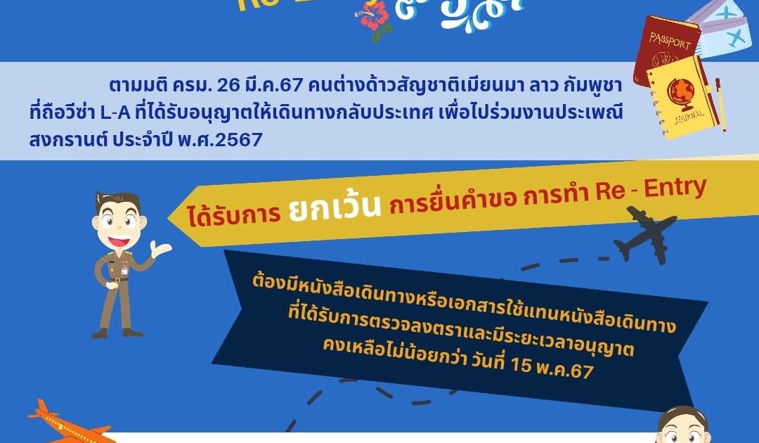 ได้รับอนุญาตให้เดินทางกลับประเทศต้นทางเพื่อไปร่วมงานประเพณีสงกรานต์ ประจำปี พ.ศ.2567 “ตั้งแต่วันที่ 1 เม.ย. – 15 พ.ค.67 ”โดยได้รับการยกเว้นการยื่นคำขอการทำ Re – Entry แต่ต้องเดินทางกลับเข้ามาภายในวันที่ 15 พ.ค.67 หากกลับไม่ทัน ให้ถือว่า การอนุญาตสิ้นสุด