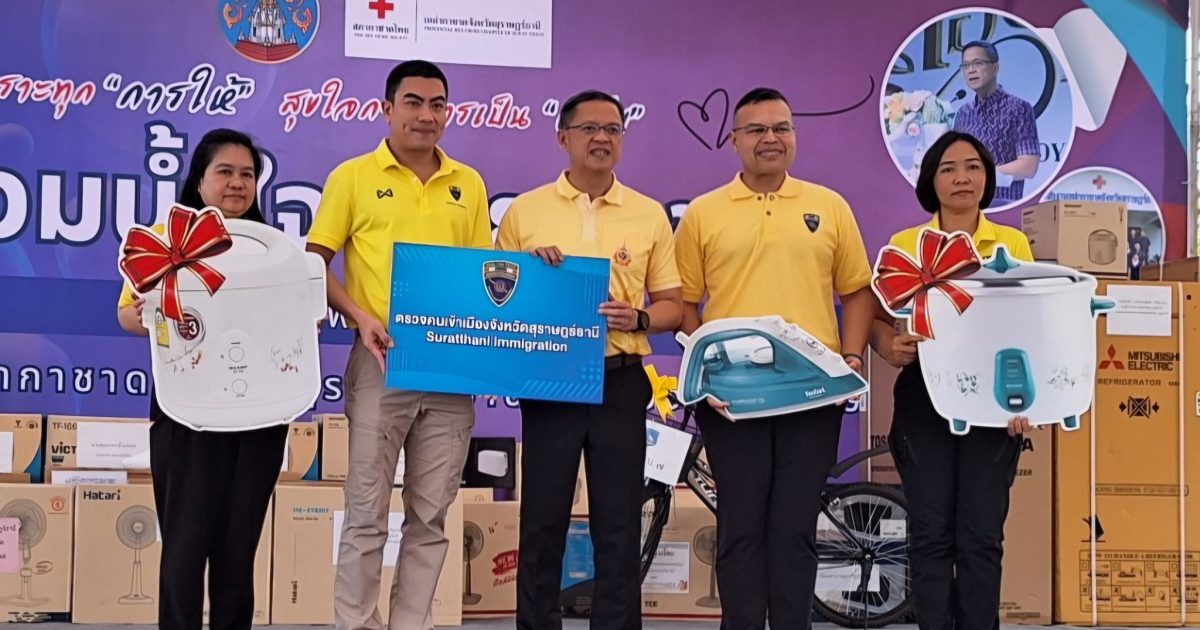 วันที่ 5 ก.พ.68 เวลา 11.00 น. ว่าที่ พ.ต.อ.นฤวัต พุทธวิโร ผกก.ตม.จว.สุราษฎร์ธานี และ พ.ต.ท.พิงคะรัตน์ ซ้ายขวัญ รอง ผกก.ตม.จว.สุราษฎร์ธานี พร้อมด้วย ข้าราชการตำรวจในสังกัด ร่วมมอบสิ่งของสนับสนุนการจัดงานออกร้านเหล่ากาชาดจังหวัดสุราษฎร์ธานี “วันรวมน้ำใจ ช่วยกาชาด” ณ สำนักงานเหล่ากาชาดจังหวัดสุราษฎร์ธานี อ.เมือง จว.สุราษฎร์ธานี โดยมีนายธีรุตม์ ศุภวิบูลย์ผล ผู้ว่าราชการจังหวัดสุราษฎร์ธานี เป็นประธานการรับมอบ