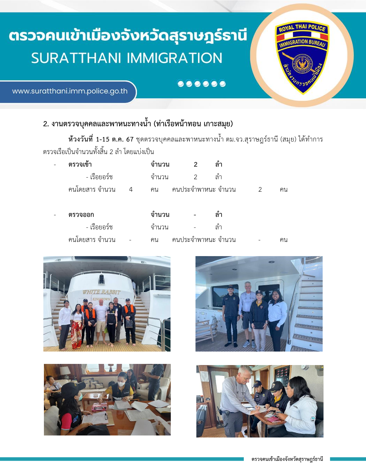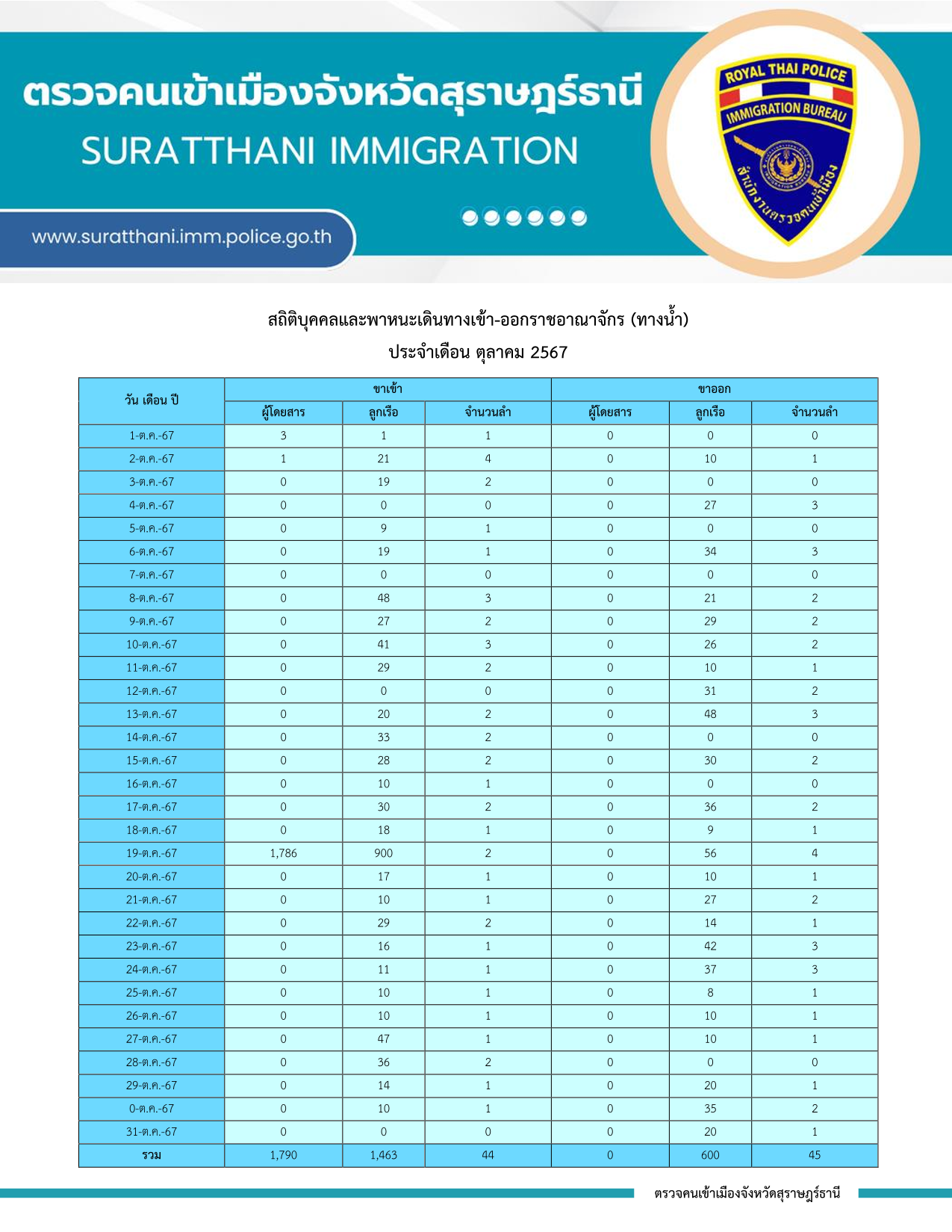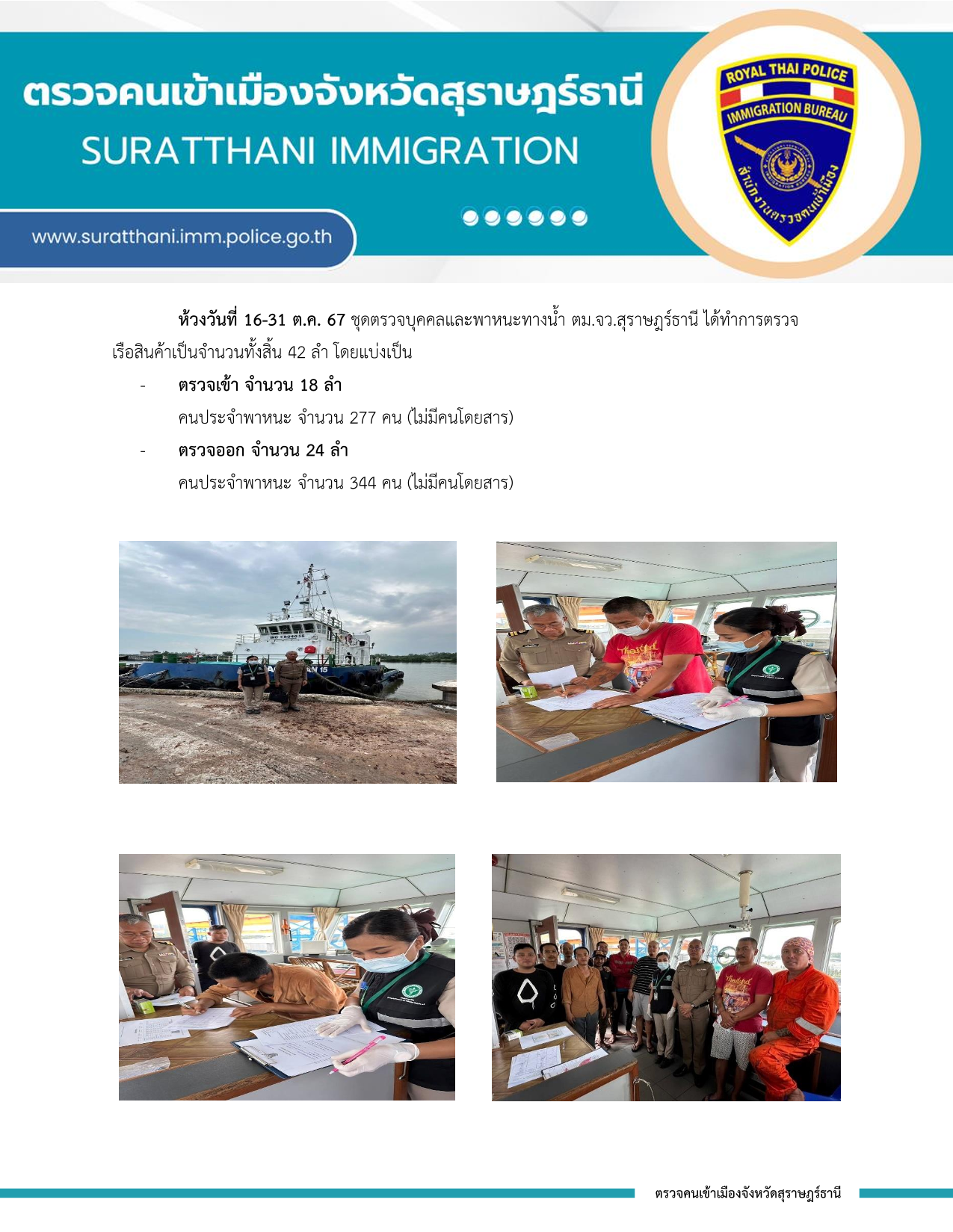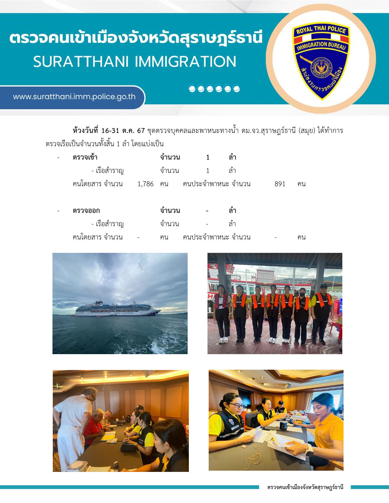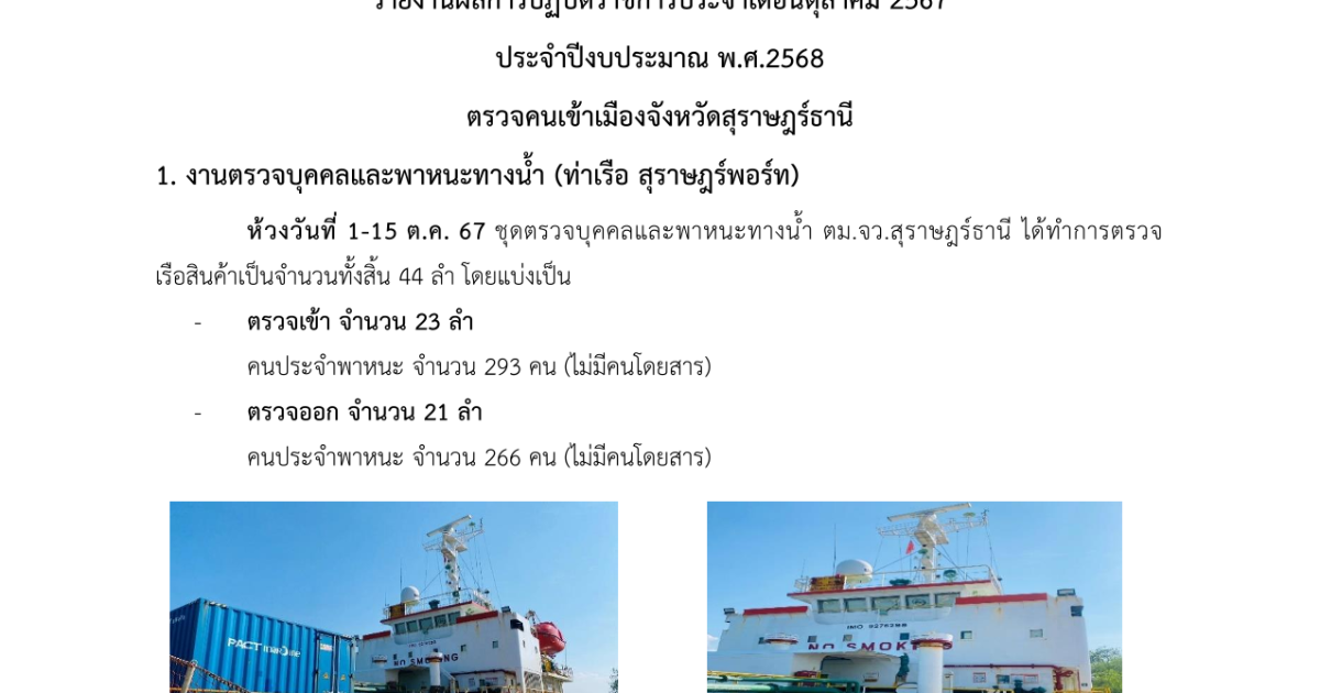 รายงานผลการปฏิบัติราชการ งานตรวจบุคคลและพาหนะทางน้ำ ประจำเดือน ตุลาคม 2567 31 ตุลาคม 2567 โดย adminnut / ข่าวภารกิจผู้บังคับบัญชา และ เหตุการณ์ข่าวสาร ที่เกี่ยวข้องกับ ตม.จว.สุราษฎร์ธานี,งานตรวจบุคคลและพาหนะ ต.ค.67 Post Views: 17