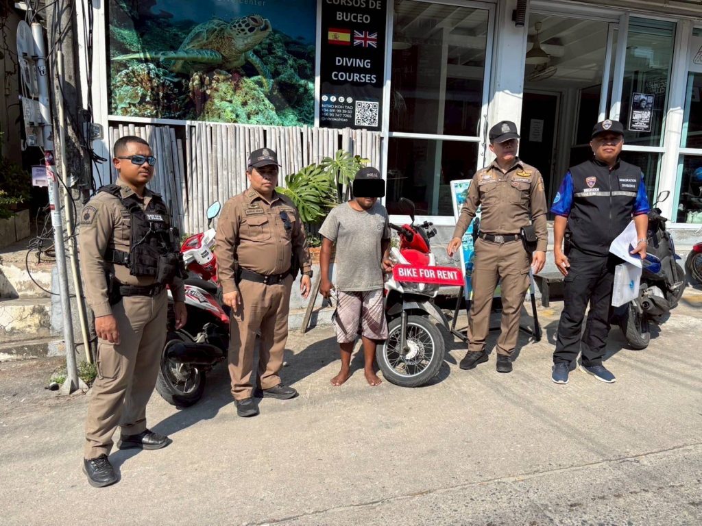 สถานที่จับกุม ร้านรถเช่า บริเวณหน้าไนโตรเกสเฮ้าส์ ม.2 ต.เกาะเต่า อ.เกาะพะงัน จว.สุราษฎร์ธานี