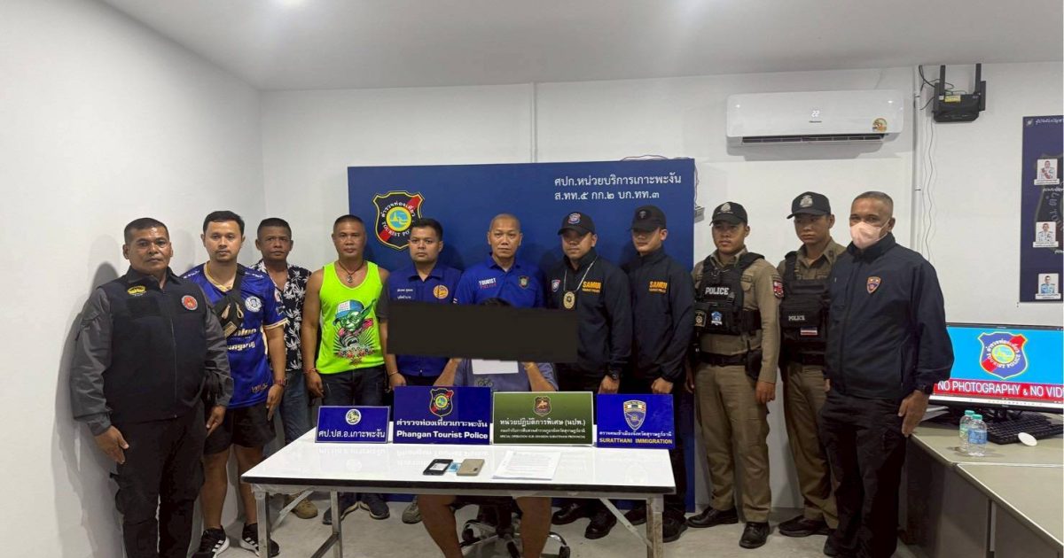 วันที่ 12 พ.ค. 2568 เวลา 22.40 น. ร.ต.อ.สิริวัฒน์ สมหวัง รอง สว ตม.จว. สุราษฎร์ธานี ร่วมกับ เจ้าหน้าที่ตำรวจ สภ.เกาะพะงัน, ส.ทท.5 กก.2 บก.ทท.3,กก.สส.ภ.8, กก.สส.ภ.จว.สุราษฎร์ธานี และ ฝ่ายปกครองอำเภอเกาะพะงัน ร่วมกันจับกุมบุคคลสัญชาติไทย