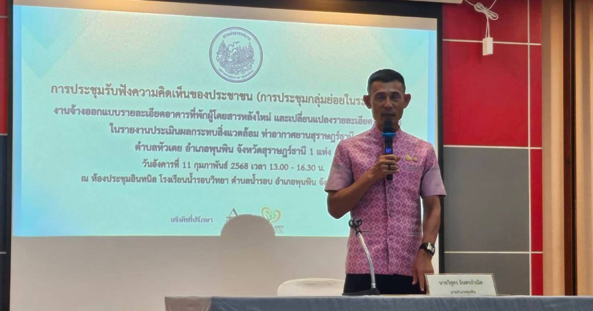 ร่วมประชุมรับฟังความคิดเห็นของประชาชน (การประชุมกลุ่มย่อยในระดับพื้นที่ี) โครงการจ้างออกแบบรายละเอียดอาคารที่พักผู้โดยสาร และเปลี่ยนแปลงรายละเอียดโครงการในรายงานประเมินผลกระทบสิ่งแวดล้อม ท่าอากาศยานสุราษฎร์ธานี