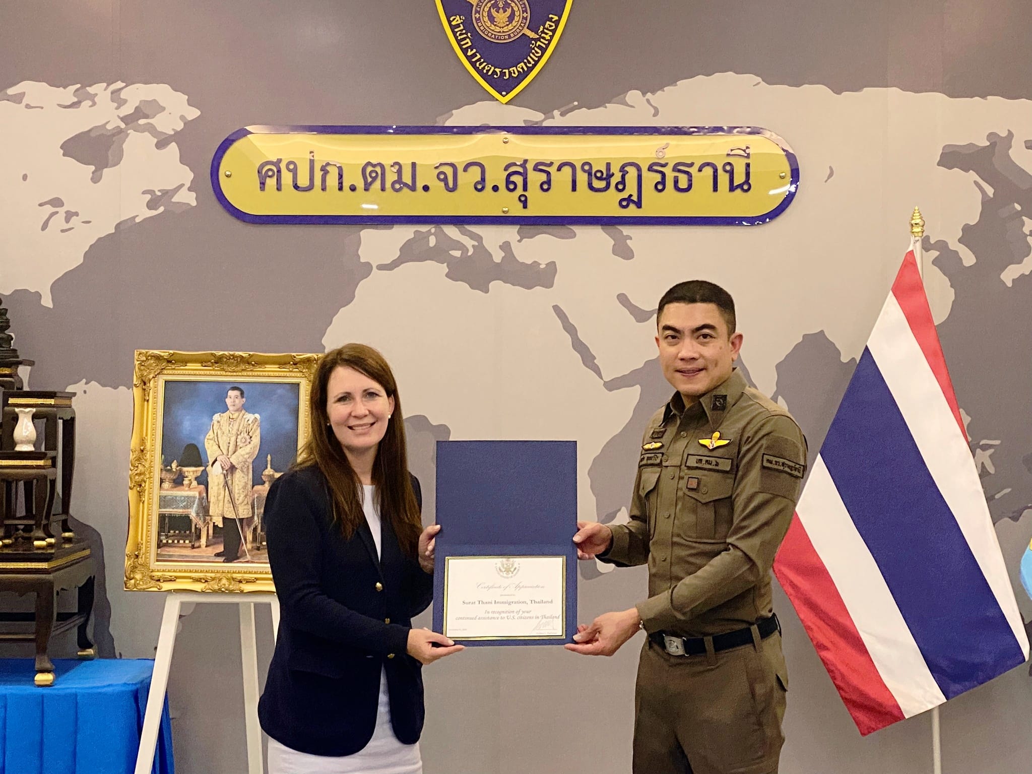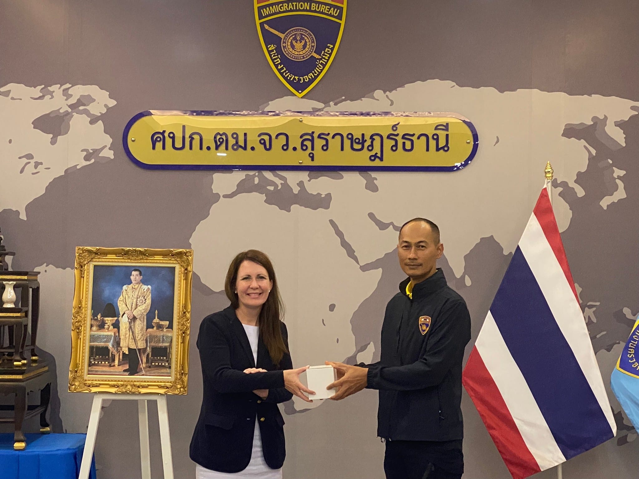 นางแคทเธอรีน เอฟ ปีเตอร์สัน (Ms. Katherine F. Pettersson) กงสุล สถานเอกอัครราชทูตสหรัฐอเมริกา ประจำประเทศไทย พร้อมคณะ ได้มาเยือน ตม.จว.สุราษฎร์ธานี (สมุย) โดยมี ว่าที่ พ.ต.อ.นฤวัต พุทธวิโร ผกก.ตม.จว.สุราษฎร์ธานี, พ.ต.ท.วัสส์ธนภูมิ กุลจิตติชุติพร รอง ผกก.ตม.จว.สุราษฎร์ธานี, ว่าที่ พ.ต.ต.หญิง ปาณิศา มุขรัษฎา สว.ตม.จว.สุราษฎร์ธานี และ ร.ต.อ.อรุณ มูสิกิ้ม รอง สว.ตม.จว.สุราษฎร์ธานี ให้การต้อนรับและได้ประชุมหารือ แลกเปลี่ยน รับทราบข้อมูลทั่วไป และขอความร่วมมือในการช่วยเหลือชาวอเมริกันในประเทศไทย ณ ห้องประชุมแม่น้ำ ศปก.ตม.จว.สุราษฎร์ธานี (สมุย)