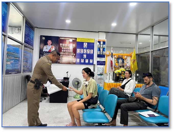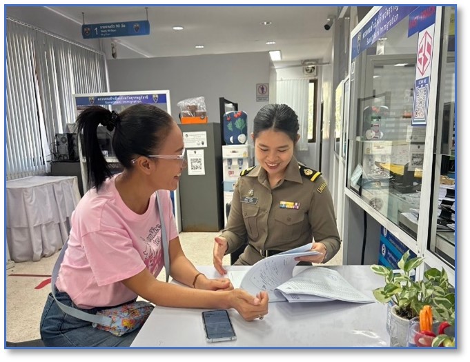 การแจ้งที่พักอาศัยฯ และแนะนำเอกสารประกอบคำร้องขอยู่ต่อฯ รวมถึงการแจ้งเบาะแสอาชญากรรมต่างๆ แก่คนต่างด้าวที่เข้ามารับบริการ