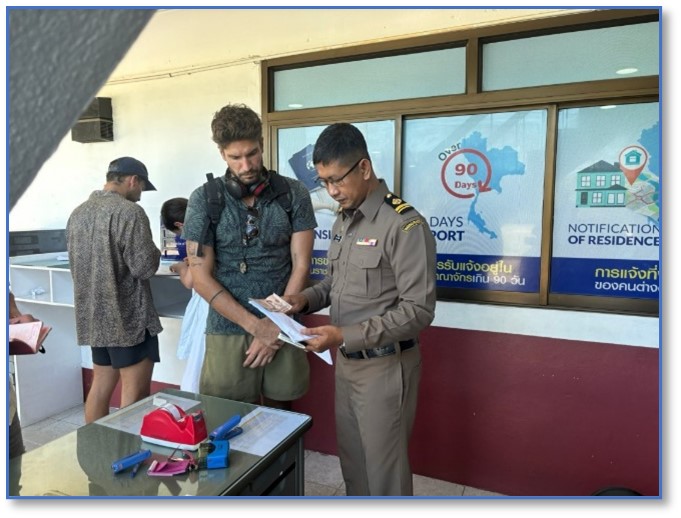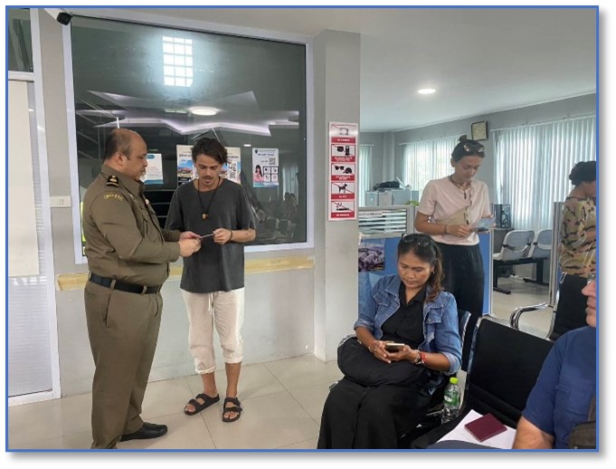 เจ้าหน้าที่ปฏิบัติงานขออยู่ต่อในราชอาณาจักรเป็นการชั่วคราวให้แก่คนต่างด้าวที่เข้ามาขอรับบริการ การรับแจ้งที่อยู่ในราชอาณาจักรเกิน 90 วัน จำนวน 8,234 ราย ประกอบด้วยสัญชาติเมียนมา 7,180 ราย สัญชาติลาว 412 สัญชาติกัมพูชา 108 สัญชาติฝรั่งเศส 64 สัญชาติ บริติช 78 สัญชาติรัสเซีย 59 ราย และสัญชาติอื่นๆ 333 ราย