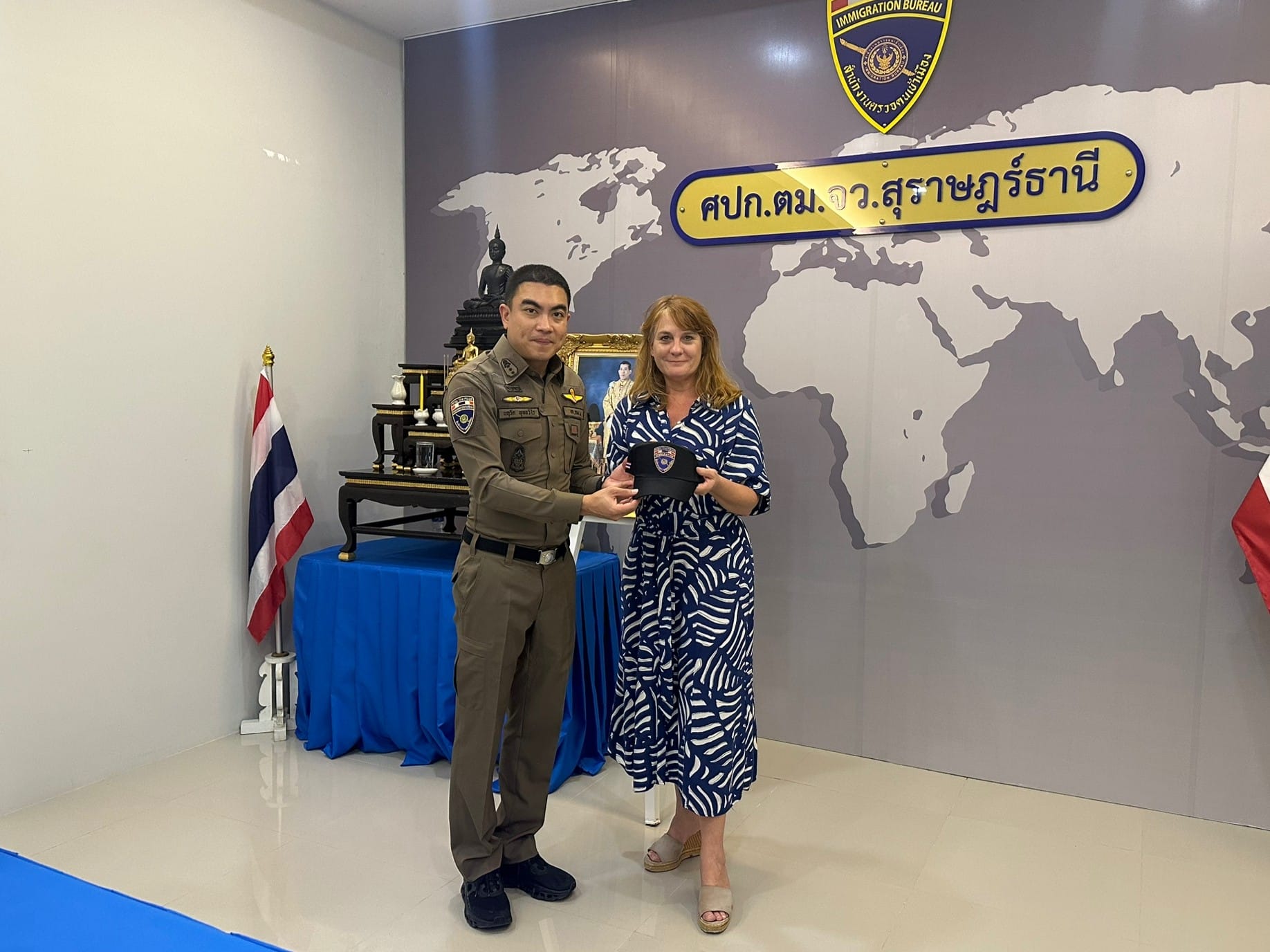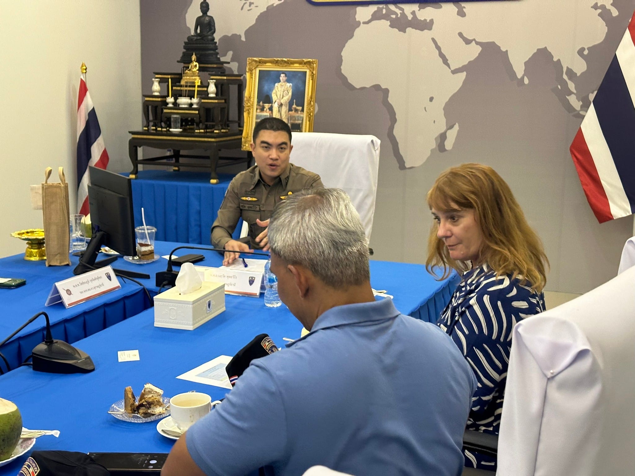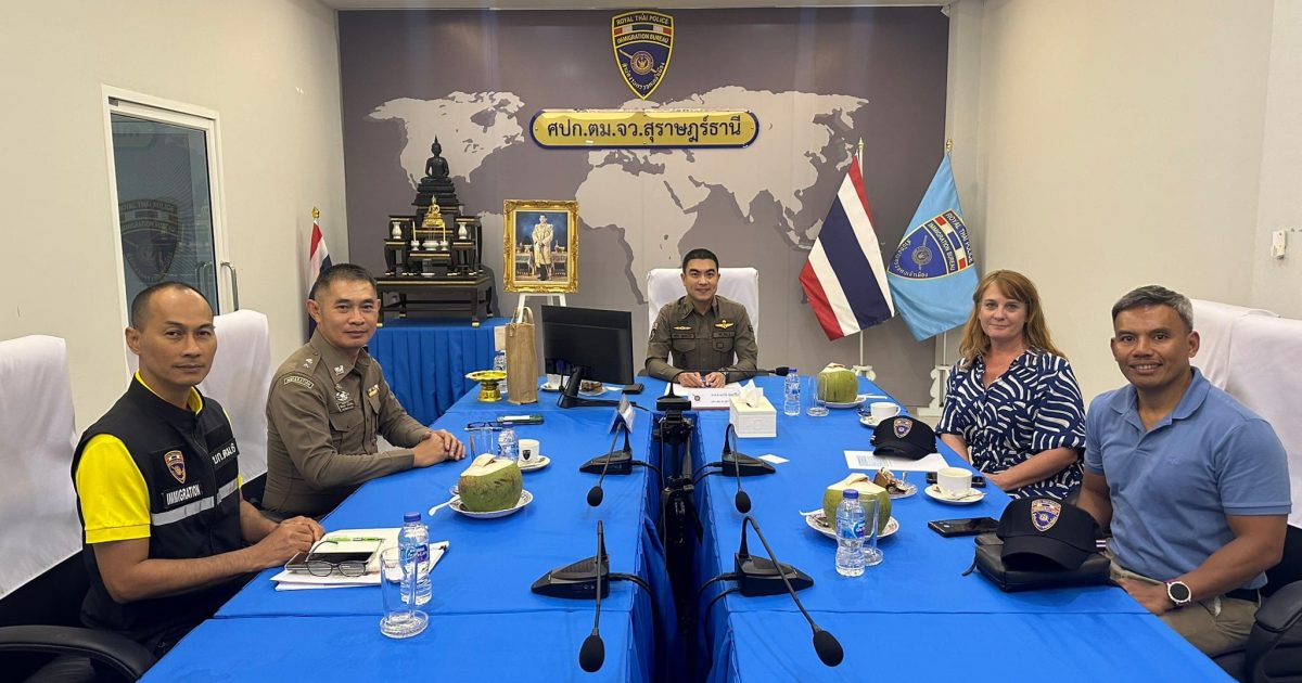 วันที่ 5 มิ.ย. 67 เวลา 14.30 น. นางสาวเคิร์สเตน เฟลทเชอร์ (Ms.Kirsten Fletcher) กงสุลใหญ่ออสเตรเลียประจำประเทศไทย พร้อมด้วย ร.ท.วุฒิไกร จิตสมัคร์ ผู้จัดการกงสุลและหนังสือเดินทางฯ ได้มาเยือนตม.จว.สุราษฎร์ธานี (สมุย) โดยมี ว่าที่ พ.ต.อ.นฤวัต พุทธวิโร ผกก.ตม.จว.สุราษฎร์ธานี พร้อมด้วย พ.ต.ท.วัสส์ธนภูมิ กุลจิตติชุติพร รอง ผกก.ตม.จว.สุราษฎร์ธานี และ ร.ต.อ.อรุณ มูสิกิ้ม รอง สว.ตม.จว.สุราษฎร์ธานี ให้การต้อนรับและได้ประชุมหารือ แลกเปลี่ยน รับทราบข้อมูลทั่วไป และขอความร่วมมือในการช่วยเหลือชาวอังกฤษในประเทศไทย ณ ห้องประชุมแม่น้ำ ศปก.ตม.จว.สุราษฎร์ธานี (สมุย)