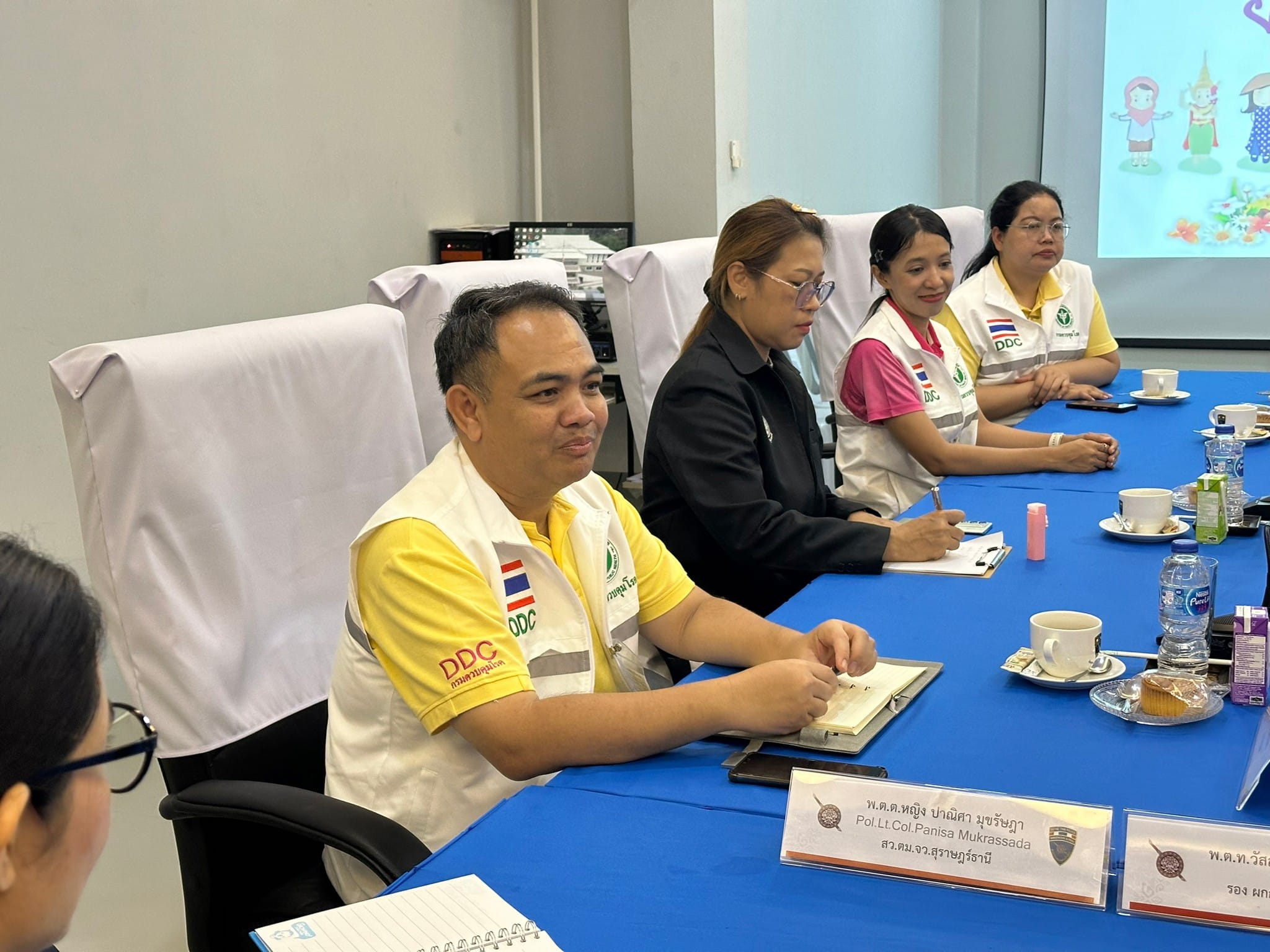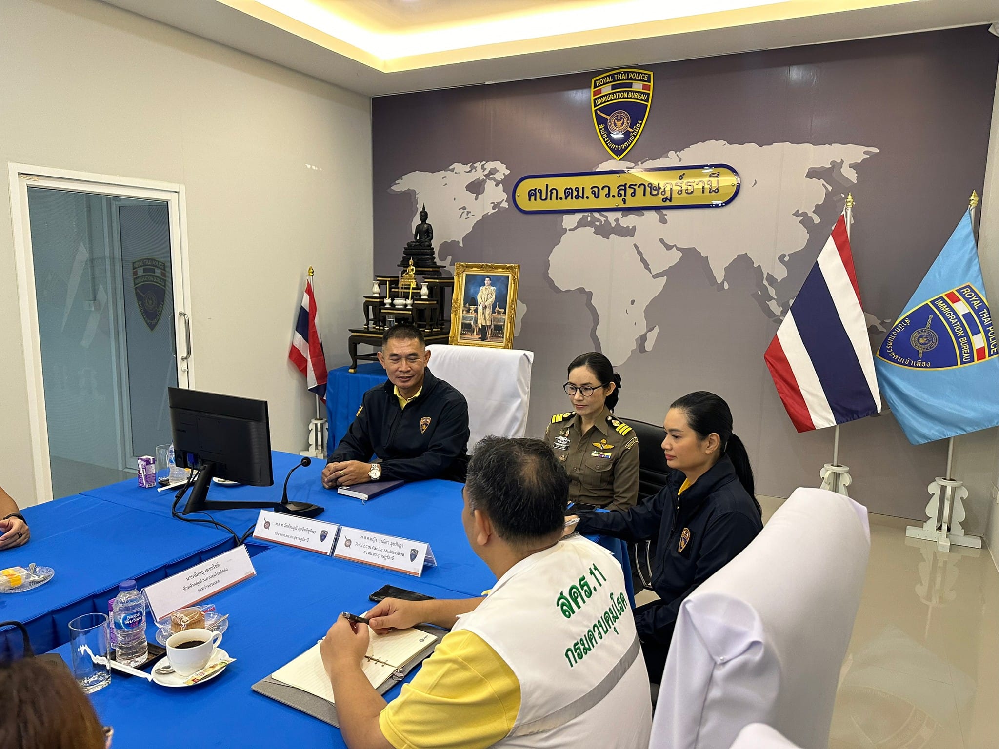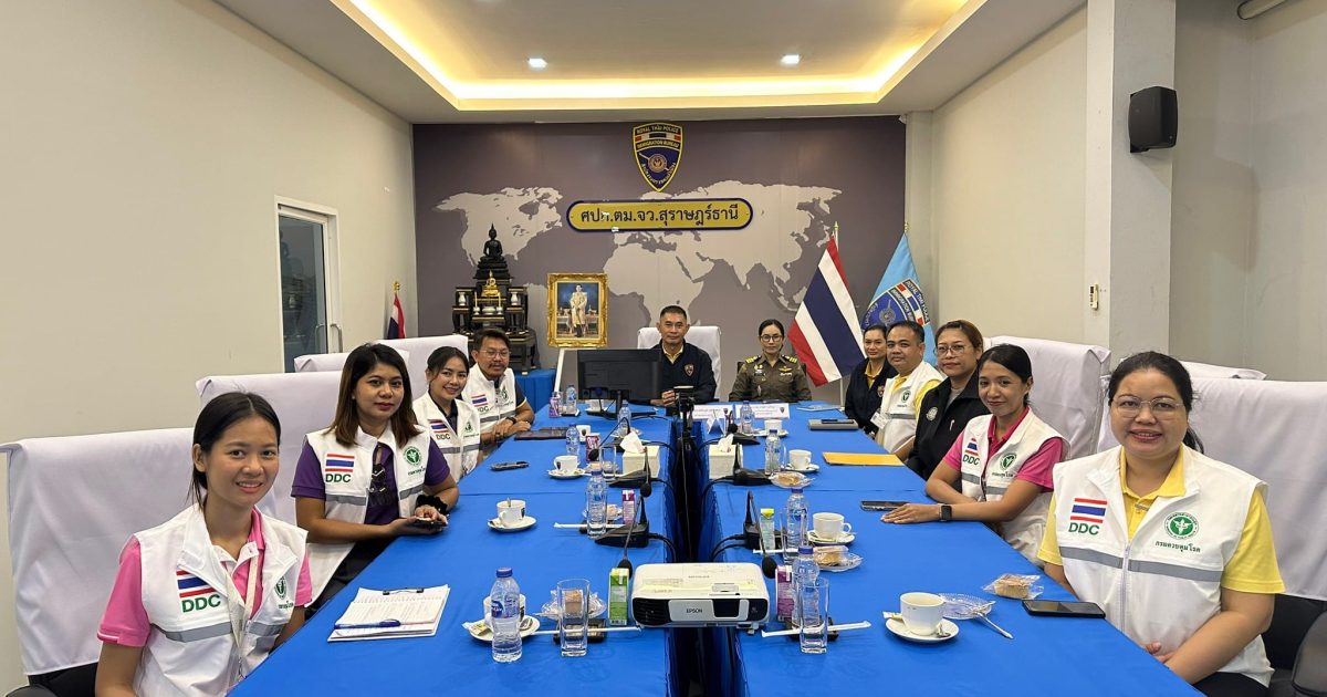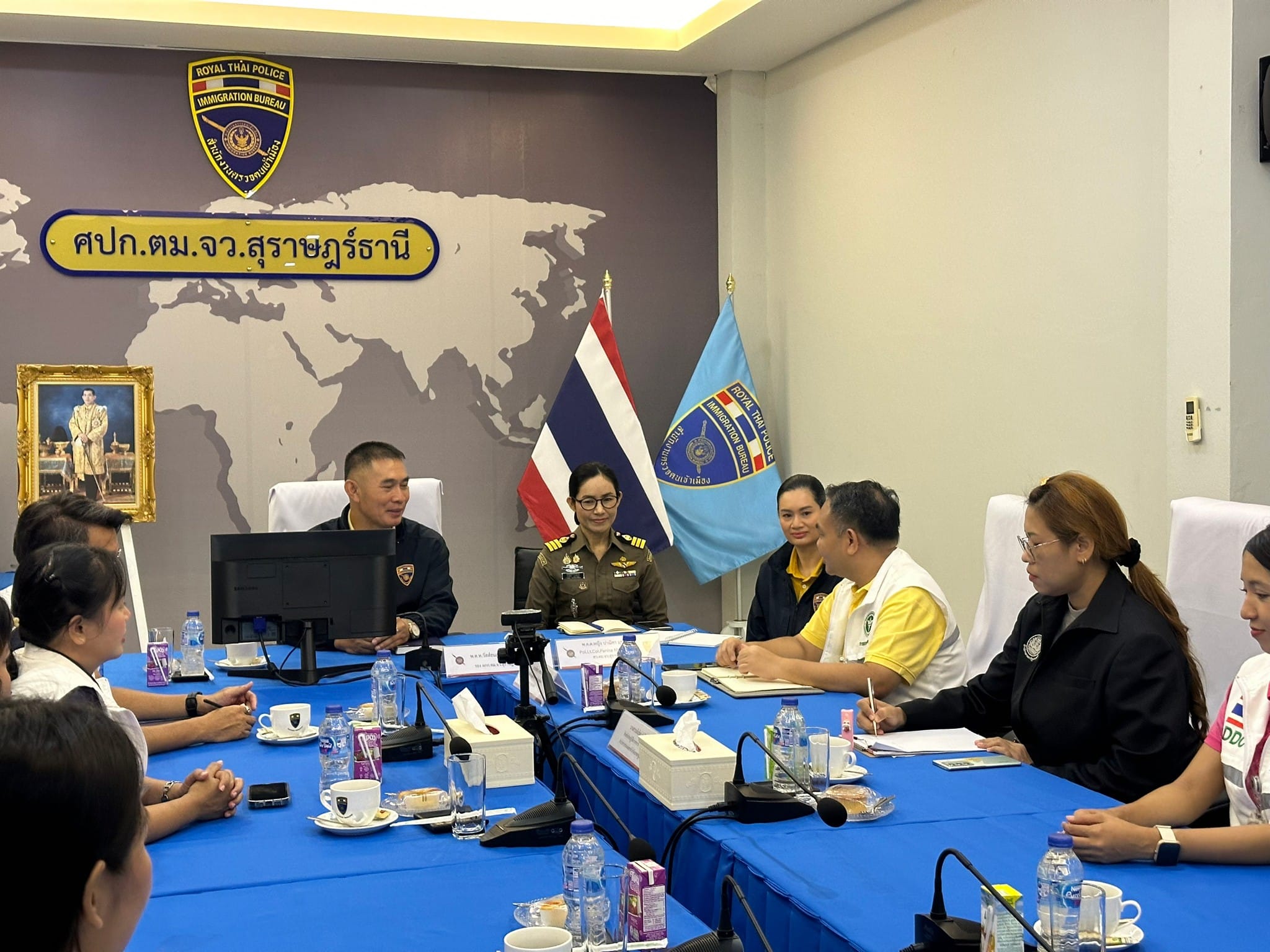 ว่าที่ พ.ต.อ.นฤวัต พุทธวิโร ผกก.ตม.จว.สุราษฎร์ธานี มอบหมายให้ พ.ต.ท.วัสส์ธนภูมิ กุลจิตติชุติพร รอง ผกก.ตม.จว.สุราษฎร์ธานี พร้อมด้วย ว่าที่ พ.ต.ต.หญิง ปาณิศา มุขรัษฎา สว. ตม.จว.สุราษฎร์ธานี ร่วมประชุมหารือกับนำคณะผู้นิเทศด่านควบคุมโรคติดต่อระหว่างประเทศท่าอากาศยานสมุย จังหวัดสุราษฎร์ธานี เพื่อร่วมพูดคุยแลกเปลี่ยนและสนับสนุนการดำเนินงานของเครือข่ายช่องทางเข้าออกประเทศอำเภอเกาะสมุย ณ ห้องประชุมแม่น้ำ ชั้น 3 ตม.จว.สุราษฎร์ธานี (สมุย)