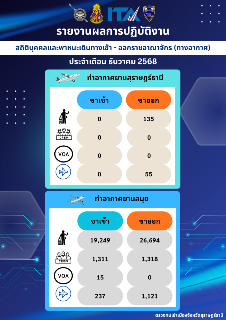 สถิติบุคคลและพาหนะเดินทางเข้า – ออกราชอาณาจักร (ทางอากาศ) ประจำเดือน ธันวาคม 2568