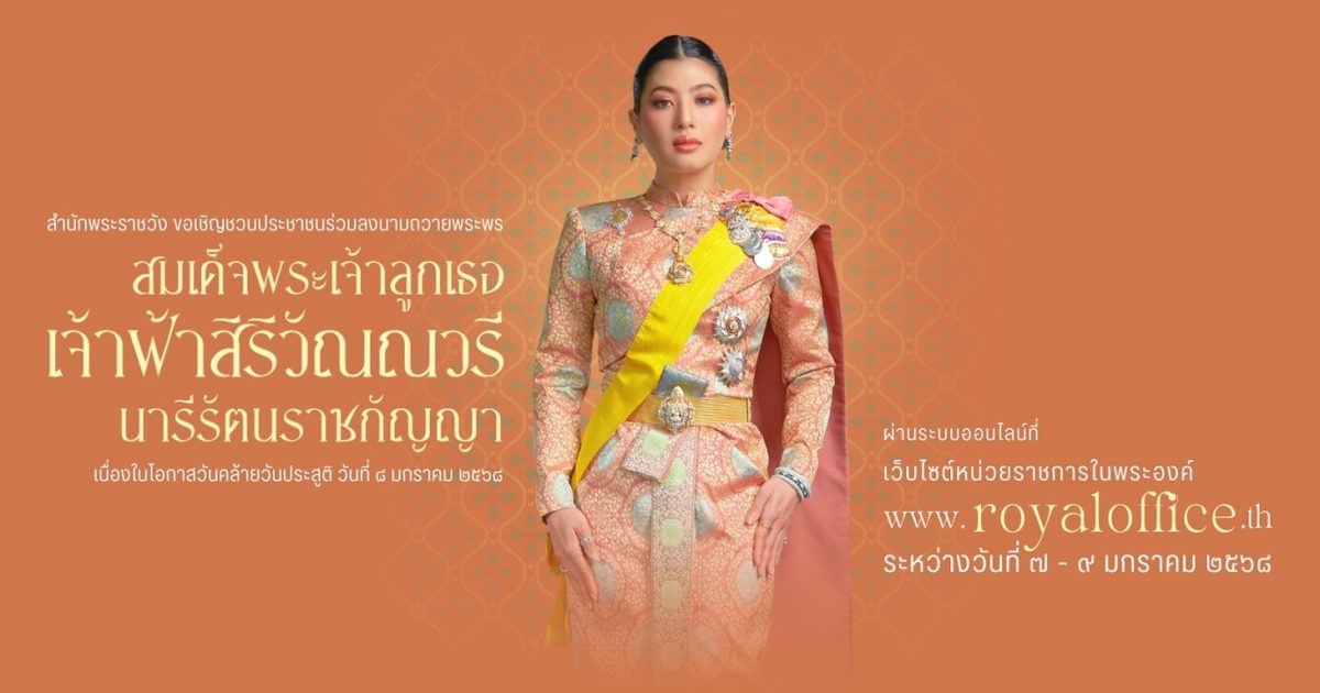 สำนักพระราชวัง ขอเชิญชวนประชาชนร่วมลงนามถวายพระพร สมเด็จพระเจ้าลูกเธอ เจ้าฟ้าสิริวัณณวรี นารีรัตนราชกัญญา เนื่องในโอกาสวันคล้ายวันประสูติ วันที่ ๘ มกราคม ๒๕๖๘